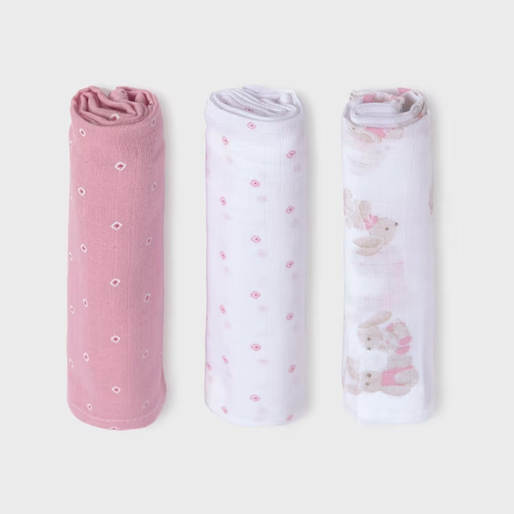 Komplekt sisaldab kolme pehmet ja õrna mähkmet, mis on valmistatud 100% puuvillast ja sobivad ideaalselt beebi tundlikule nahale.