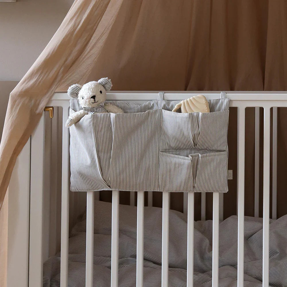 Võrevoodi korraldaja saab hõlpsasti kinnitada võrede külge, et hoida nuppe, raamatuid, pehmo mänguasju või Tetan mähkmeid magamamineku ajaks.