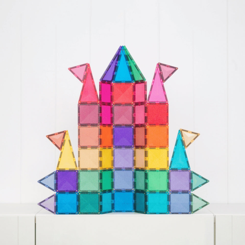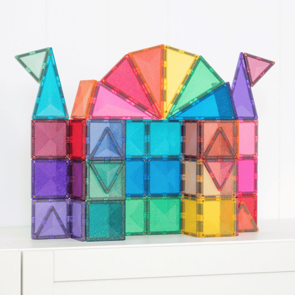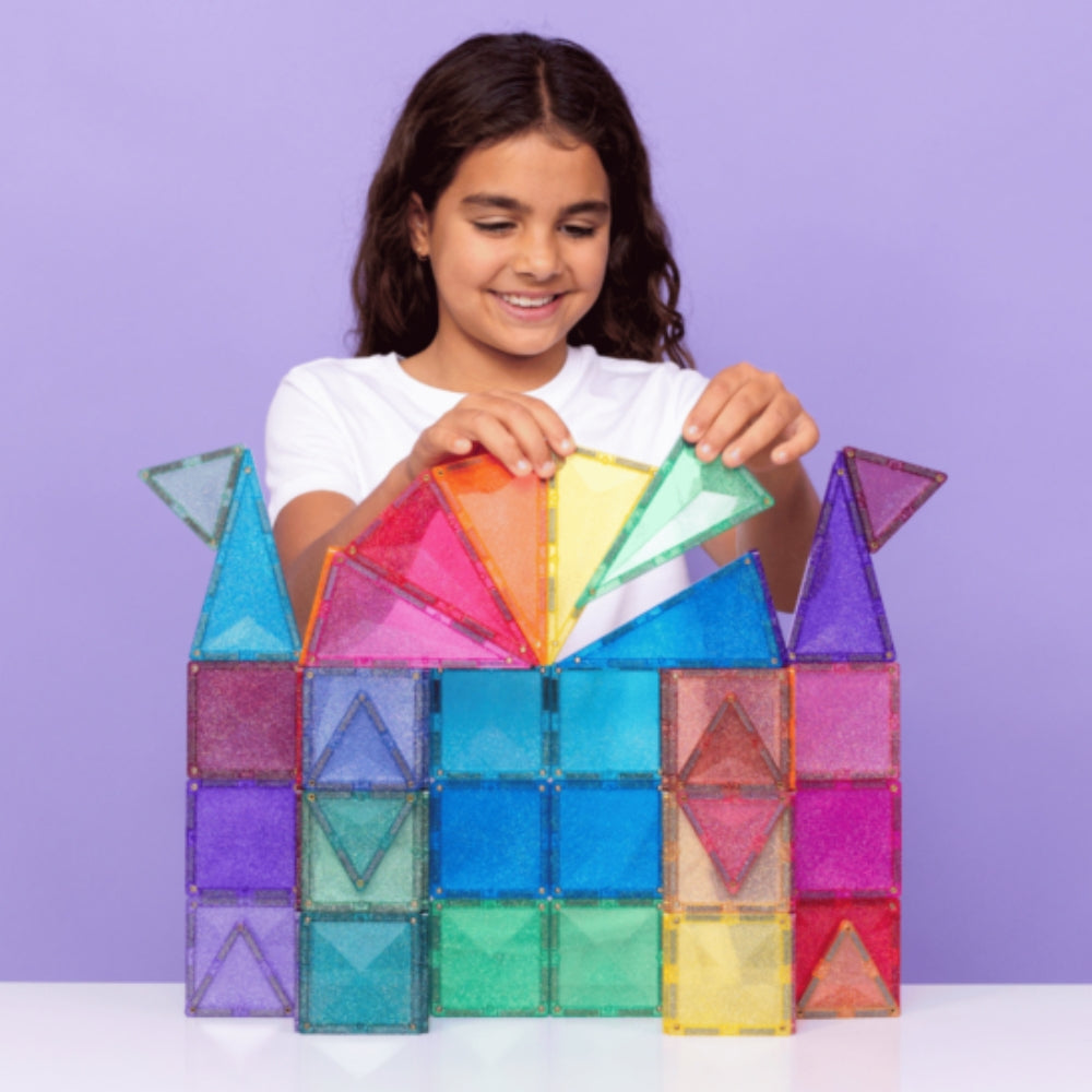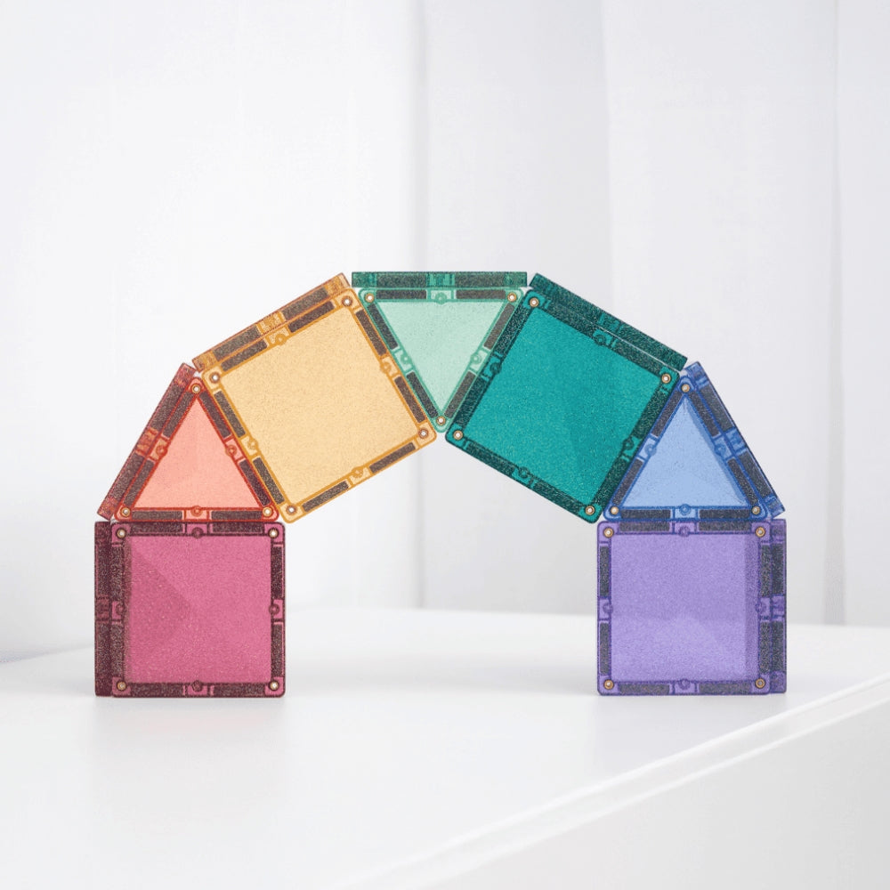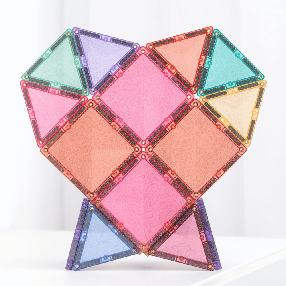 Väikeste maadeavastajate ja muinasjutuliste rändurite jaoks loodud pastell- ja vikerkaarevärvides sädelevad plaadid lisavad igale ehitisele veidi maagiat. Ruutude ja kolmnurkade (võrdkülgse ja võrdhaarnaga) magnetplokid säravad mitmevärvilise sädelusega, mis teeb lastele lõbusaks luua säravaid losse, sildu, torne, loomi ja kõike muud, mida nende kujutlusvõime suudab välja mõelda.