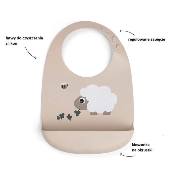 Sellel silikoonist beebisärgil on armas motiiv ja sügav tasku, mis püüab kinni kukkuvad helbed ja toidujäägid, nii et vähem satub põrandale või riietele.
