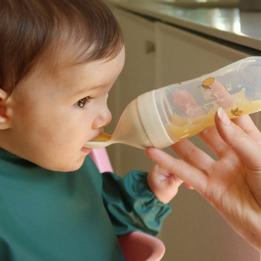 Toiduohutustest, BPA-vabadest materjalidest valmistatud komplekt koosneb silikoonpudelist, mille täidate lihtsalt toiduga ja vajutate õrnalt, et valada õige kogus toitu otse lusikale.