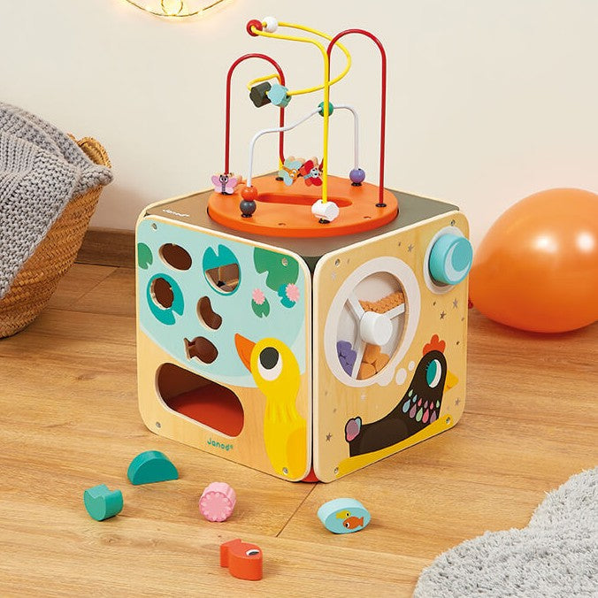 JANODi multifunktsionaalne hariduslik kuubik silmusega on ainulaadne mänguasi lastele alates 18. elukuust.