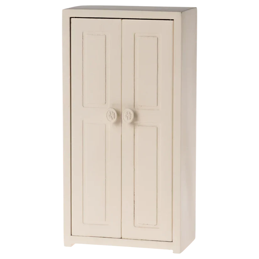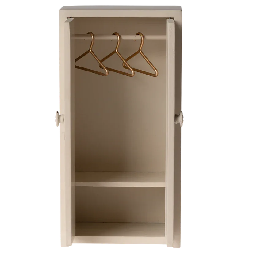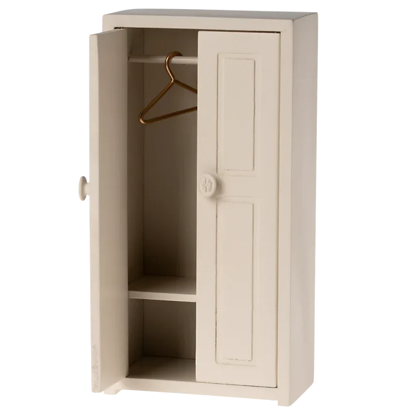 Maileg hiiremaja aksessuaarid – ilus ja stiilne kreemikasvärvi miniatuurne riidekapp.