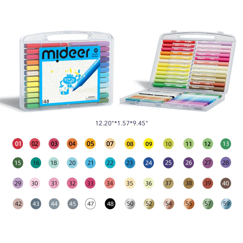 Mideeri akrüülmarkerid on pakitud praktilisse kasti, mis on mugav hoiustamiseks ja kaasavõtmiseks lasteaeda või kunstitundidesse.