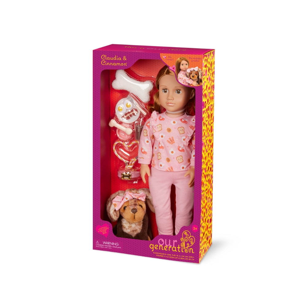 Armas Claudia beebinukk koos kutsikaga nimega Cinnamon rihma otsas ja lemmiklooma tarvikud Our Generationilt.