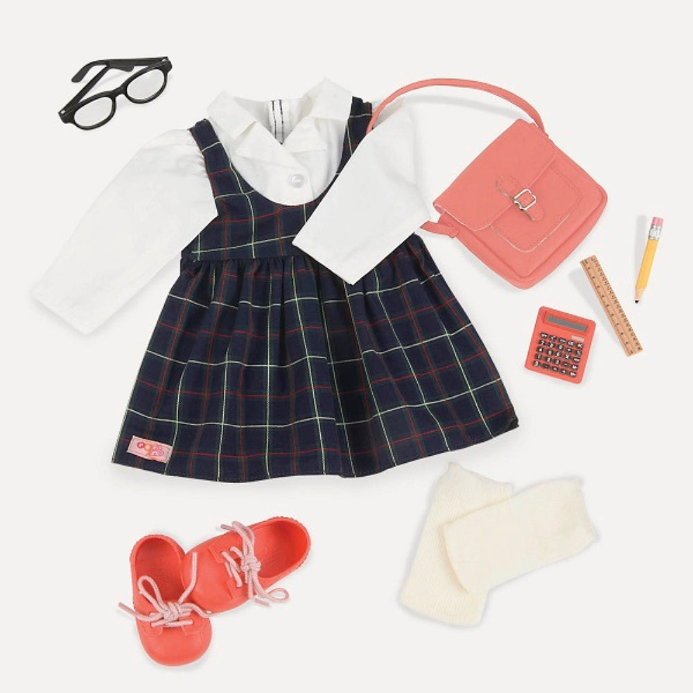 - Komplekt sisaldab: ruuduline kleit, sokid, käekott, kingad, prillid, pliiats, joonlaud, kalkulaator