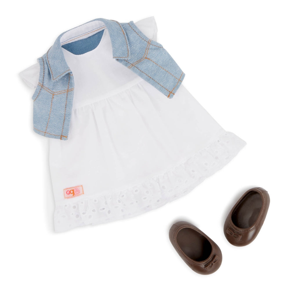 - Komplekt sisaldab: 46 cm pikkune nukk reguleeritava juuksega, valge pitsiga kleit, teksase vest, aluspesu, balleriinad, 2 kinnitatavat värvilist juukseklambrit, 2 metallist südamekujulist juukseklambrit, kamm, brošüür trendikate soengute/impressionistlike patsidega