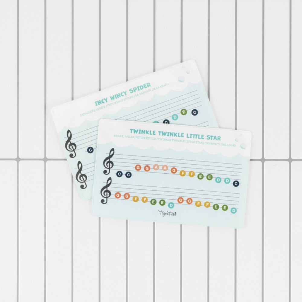 Komplektis olevad pulgad ja veekindlad noodid, mis kinnituvad vanniseinale või plaatidele, võimaldavad mängida lihtsaid, tuttavaid meloodiaid.
