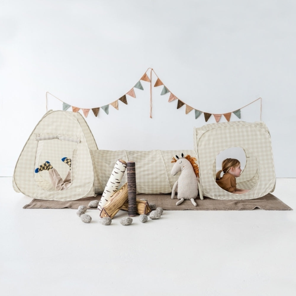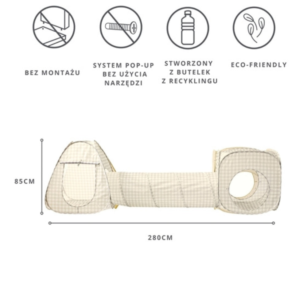 See ainulaadne laste telk tunneliga ei soodusta mitte ainult loovat mängimist, vaid lisab tänu trendikale Terrazzo Beige mustrile ka stiilse elemendi laste tuppa.