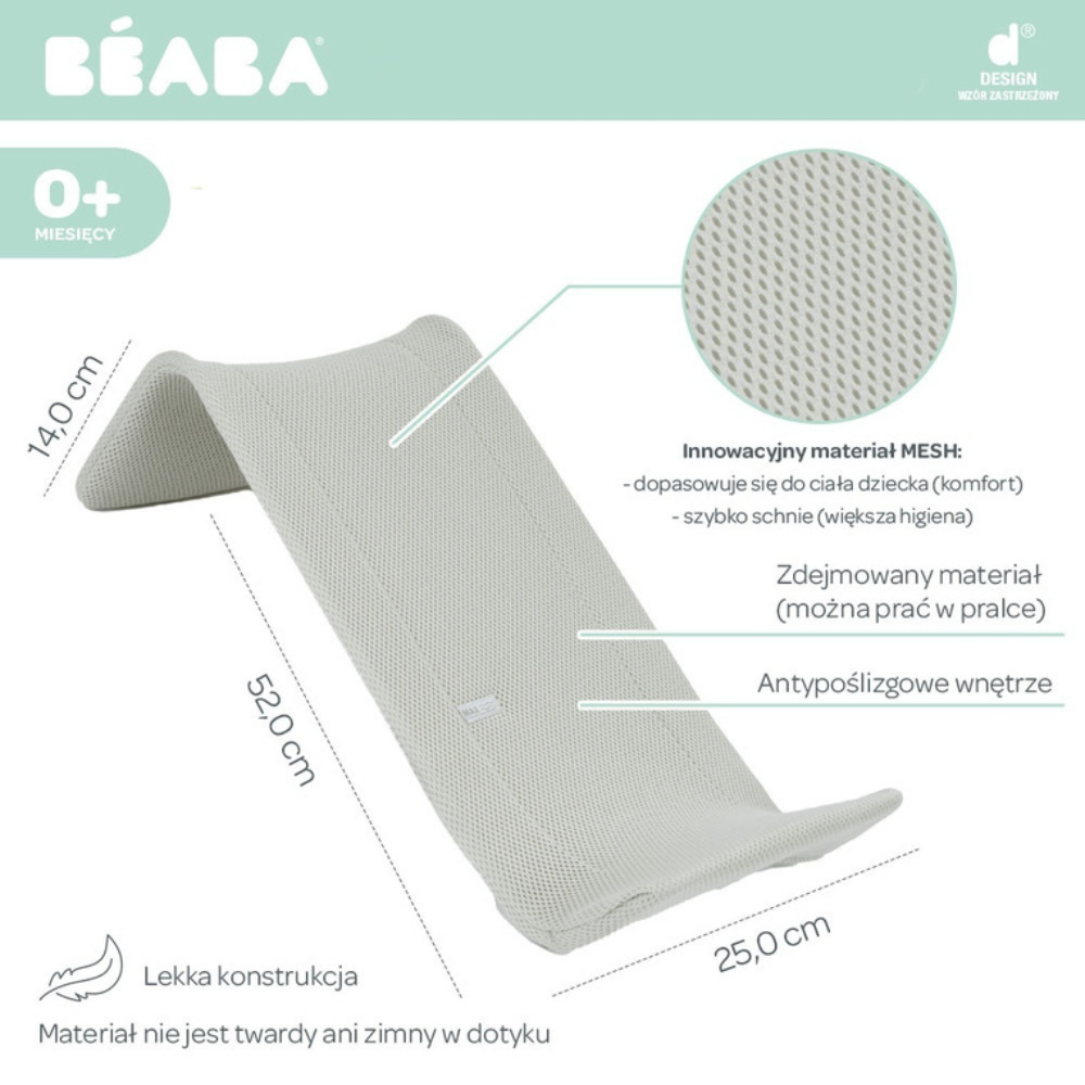 Hingav MESH-kangas ümbritseb beebi keha õrnalt ja kuivab kiiresti, mis muudab vannitoa hügieenilisena ja korras hoidmise lihtsaks.