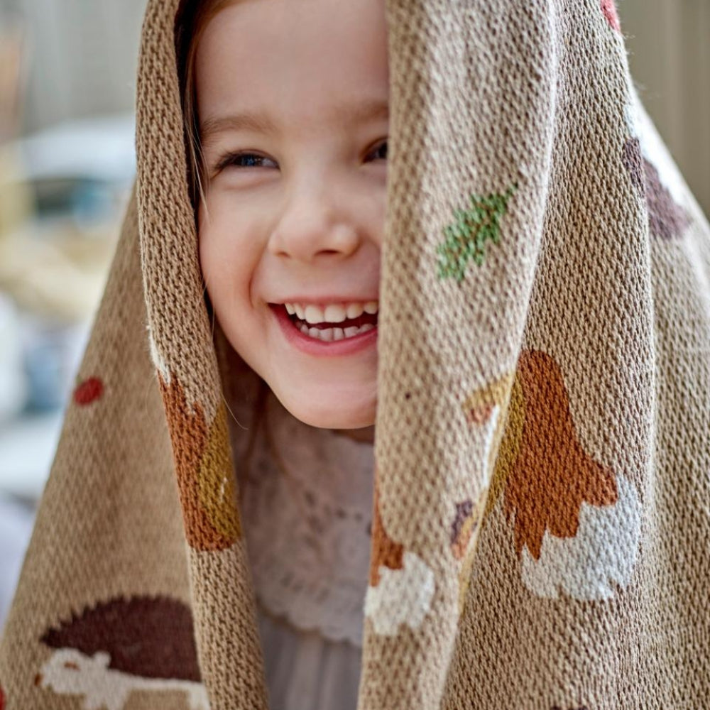 Bloomingville'i puuvillane tekk, voodikate on huvitava mustriga, millel on metsaelemendid.