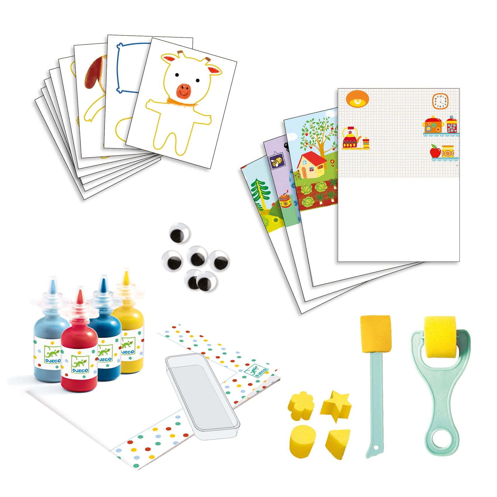 Djeco kunstikomplekt lastele värvidega maalimiseks.