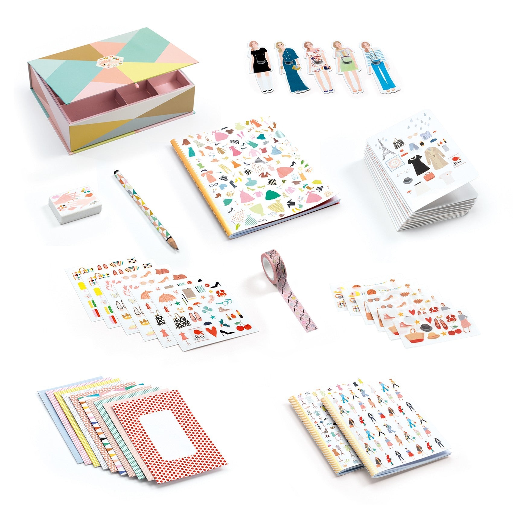 Djeco Papeteria Tinou kirjatarvete komplekt on täielik kirjatarvete karp, millel on pehmed graafilised illustratsioonid moeteemal.