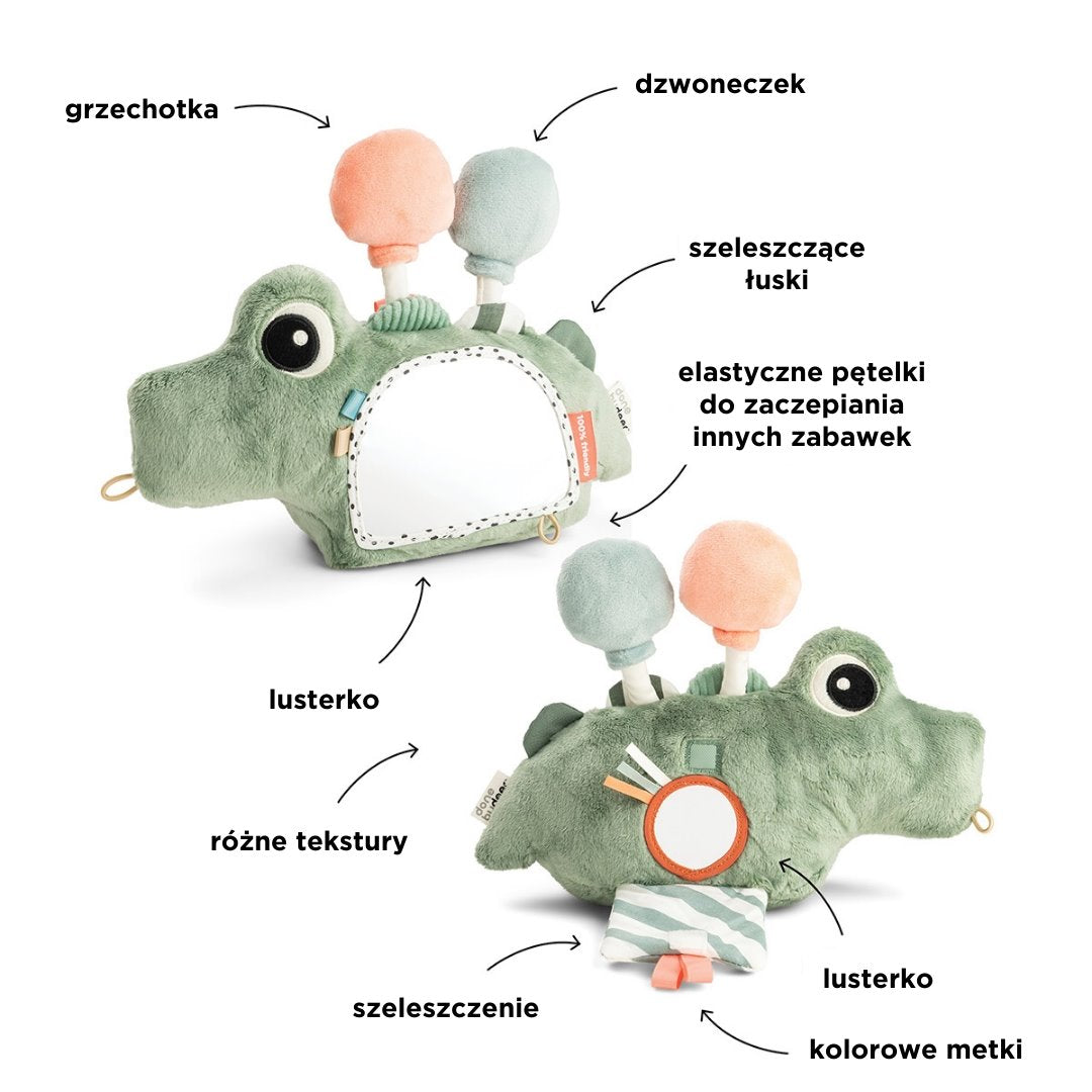 Beebipeegel on varustatud paljude sensoorsete detailidega, mis julgustavad last selles asendis kauem püsima ja mänguga tegelema.