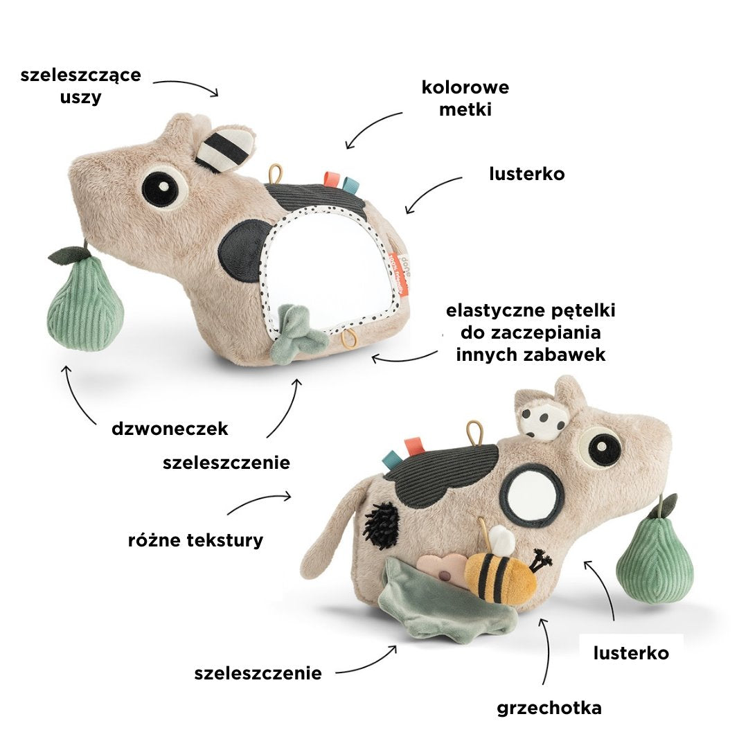 See Done By Deer'i mudel on varustatud värviliste ripatsitega, erinevate tekstuuridega ning krigisevate ja kolisevate elementidega, mis stimuleerivad meeli ja kutsuvad uurima.