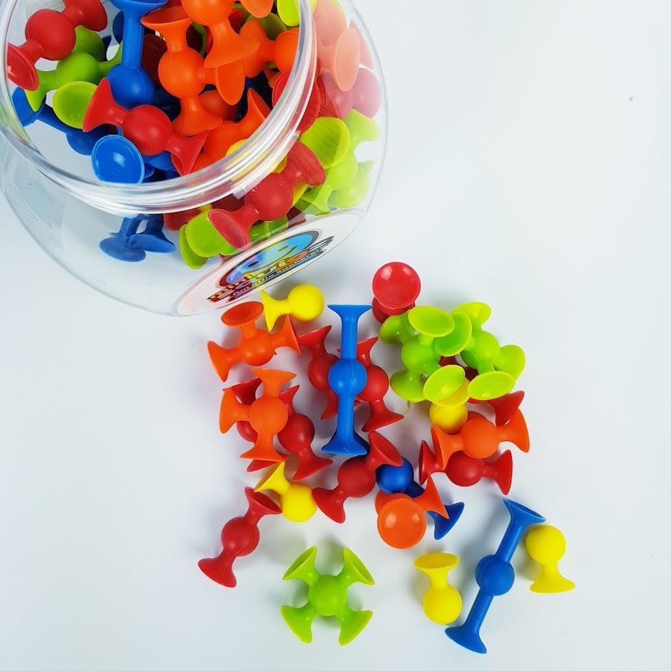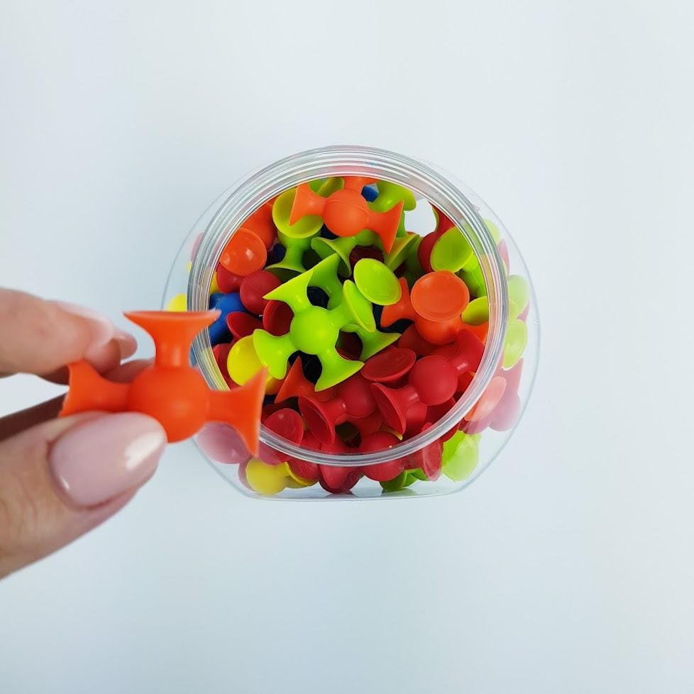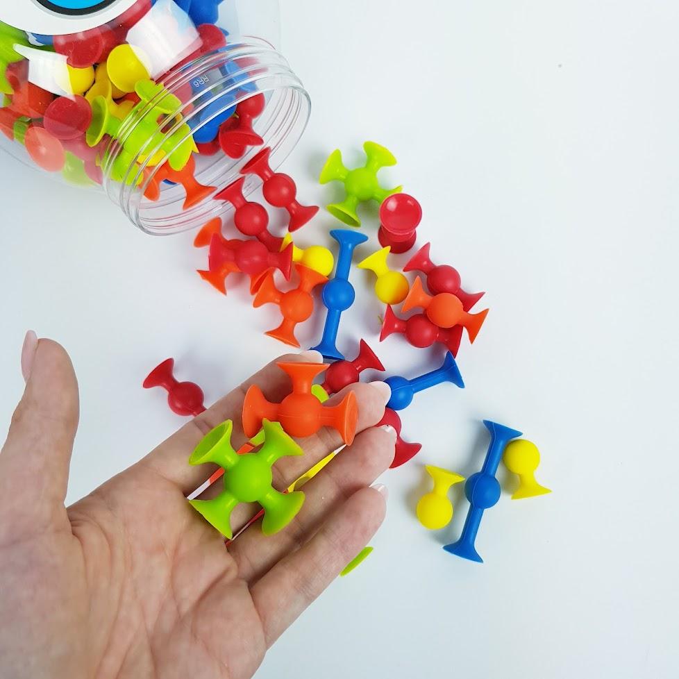Fat Brain Toysi suurepärased mini-silikoonist iminapad on paindlikud ja väga elastseks, nad kleepuvad üksteise külge ja igale siledale pinnale.
