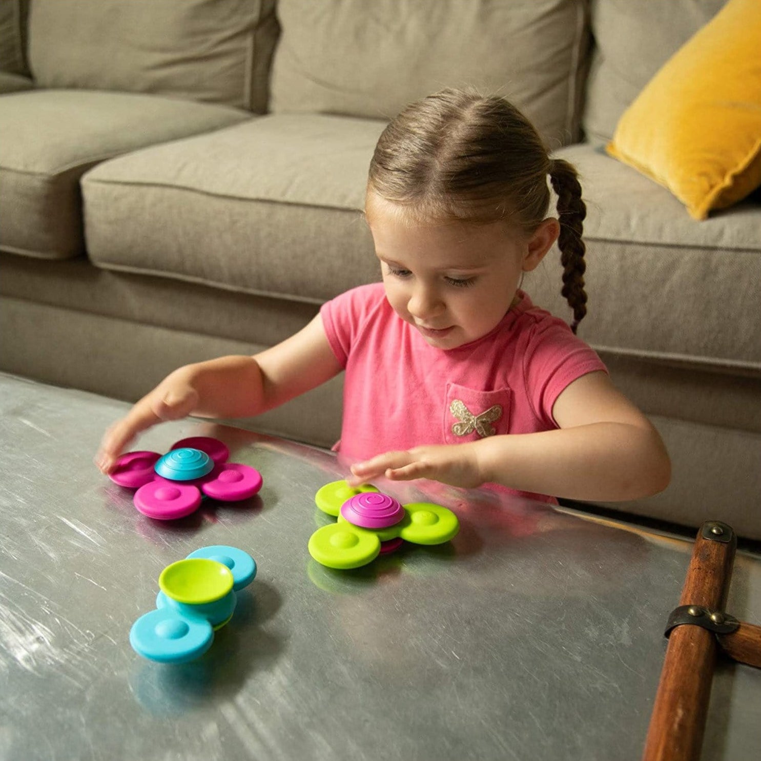 Fat Brain Toys spinnerite suured silikoonist iminapad julgustavad nii väikelapsi kui ka vanemaid lapsi keerutama.