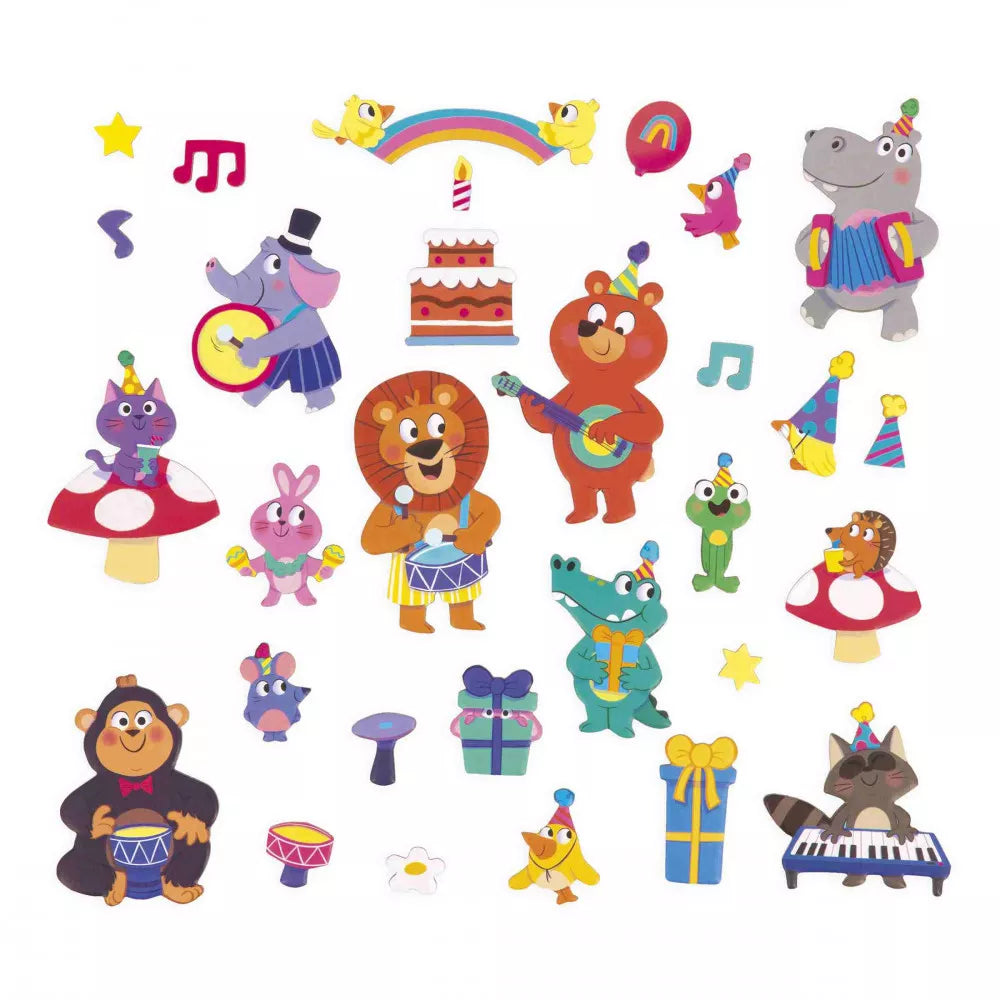 Janodi magnetiline pusle sisaldab 30 magnetit , millel on kujutatud metsa loomi, sünnipäevapidu tarvikuid, peokoristusi ja kingitusi.