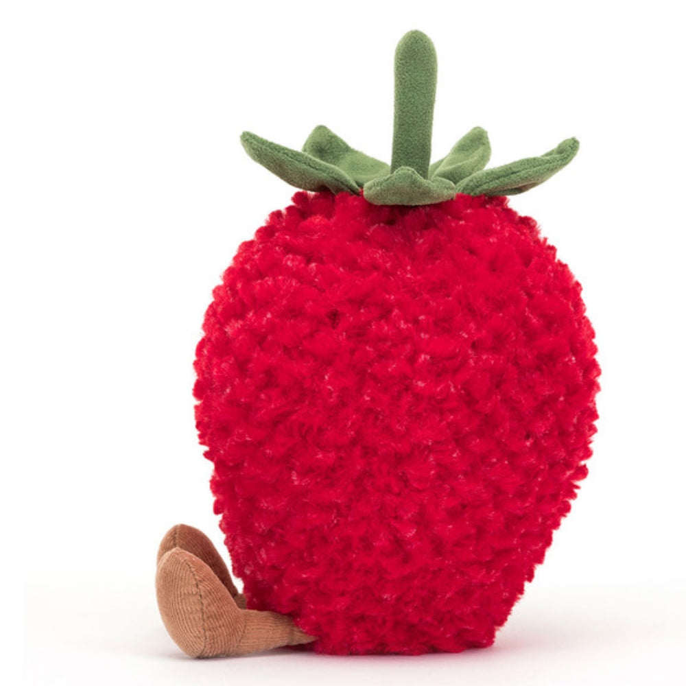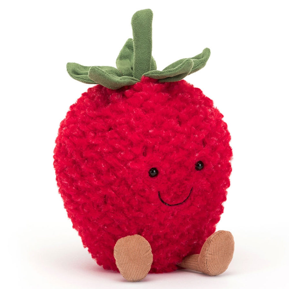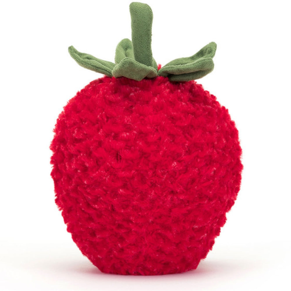 Jellycat esitab armsa maasika, mis on valmistatud eriti pehmest, tekstuurse karvaga ja intensiivse punase värvitooniga.