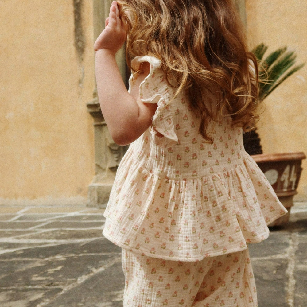 Das Modell Coco wurde aus leichtem, atmungsaktivem Musselin genäht, der sich angenehm auf der Haut anfühlt und sich sowohl für den Alltag als auch für den Sommer eignet.