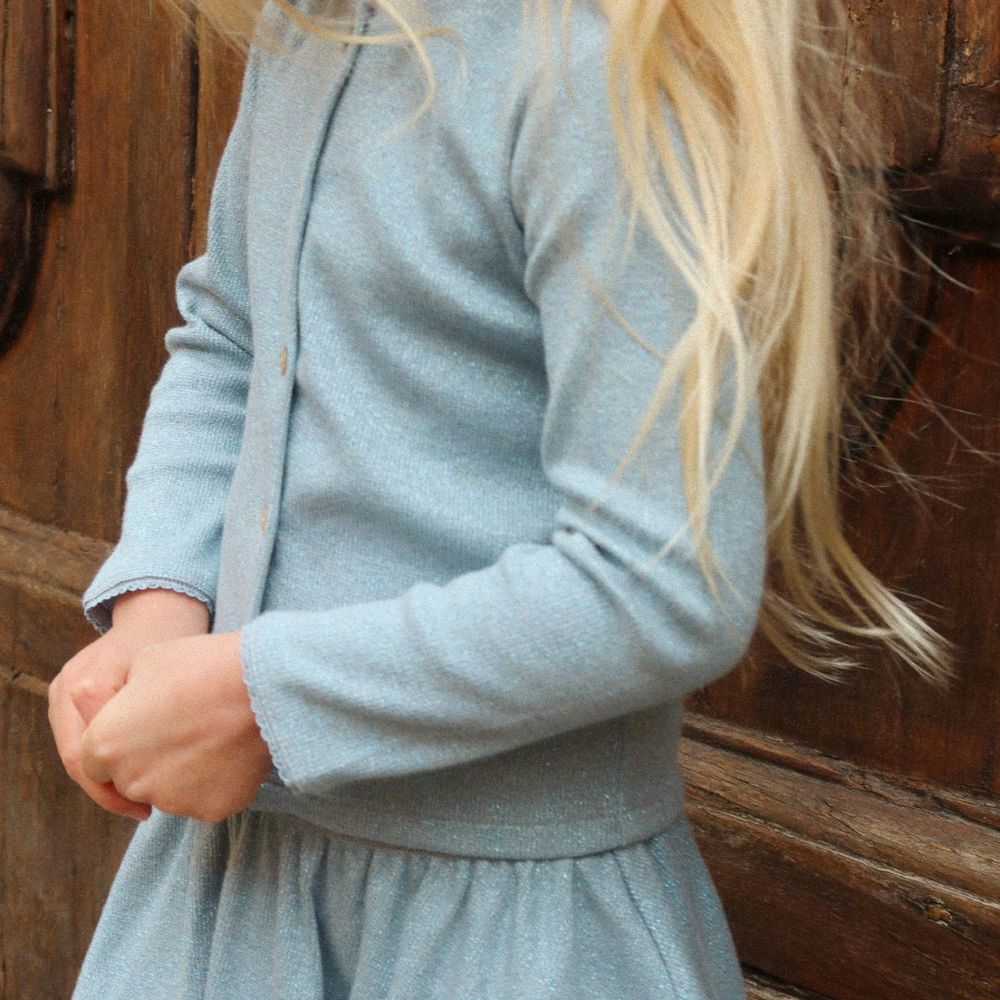 Lurexi õrn sära lisab elegantsi, samas kui kaeluse dekoratiivsed kaunistused rõhutavad kerget, tütarlapselikku kuju.