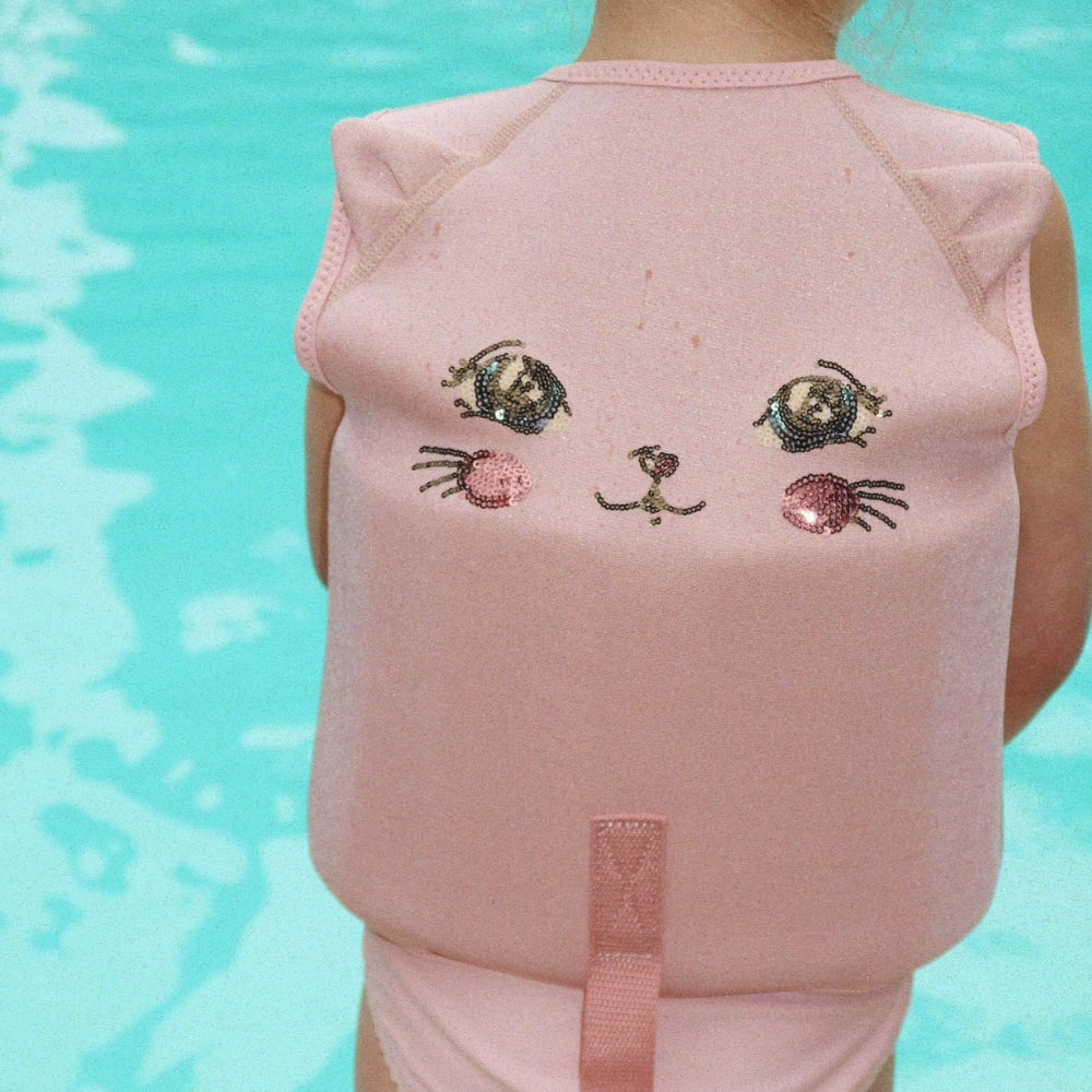 Ujumisvest, mille õlgadel on armsad kassikõrvad, on ideaalne abivahend väikelapsele, kes hakkab veega harjuma.