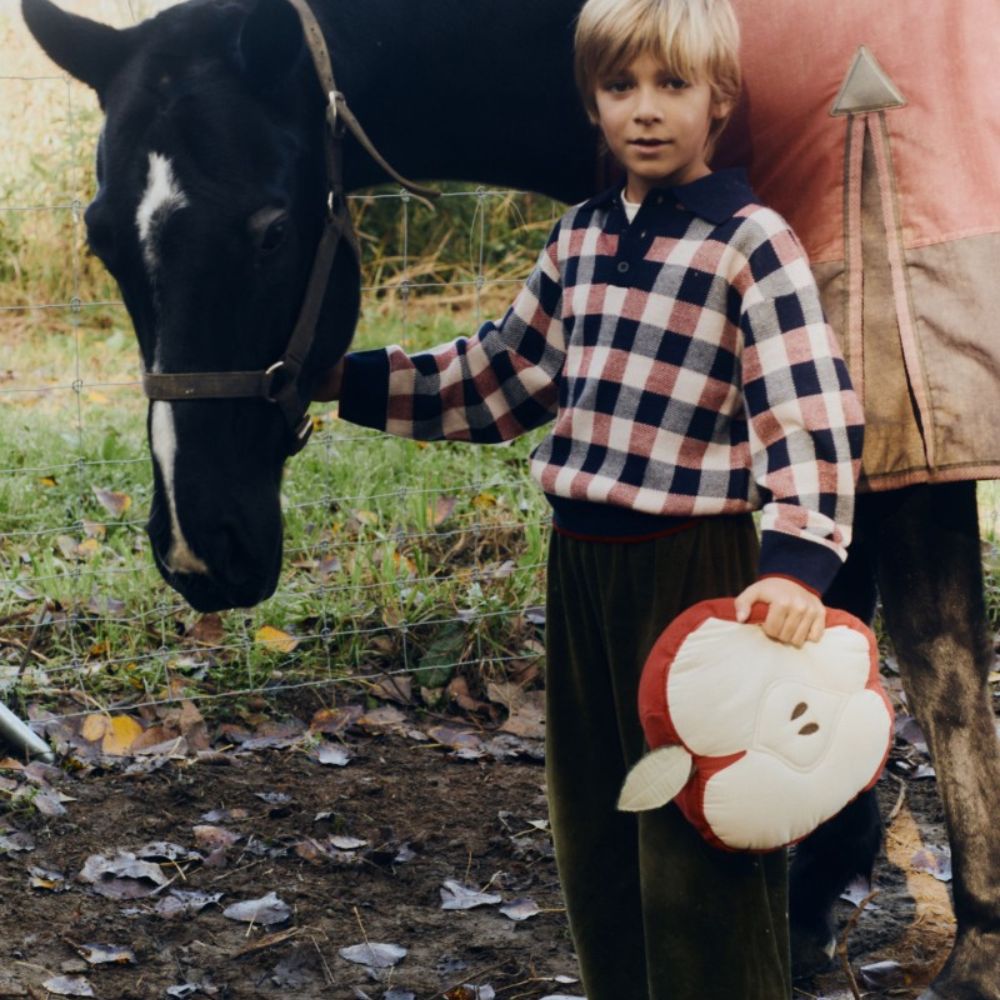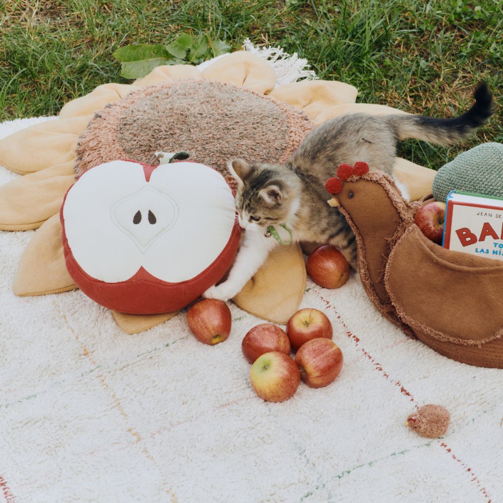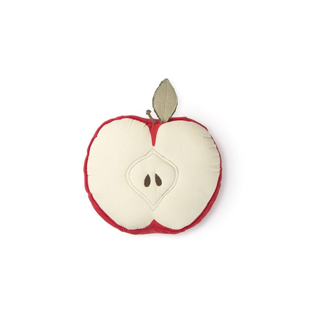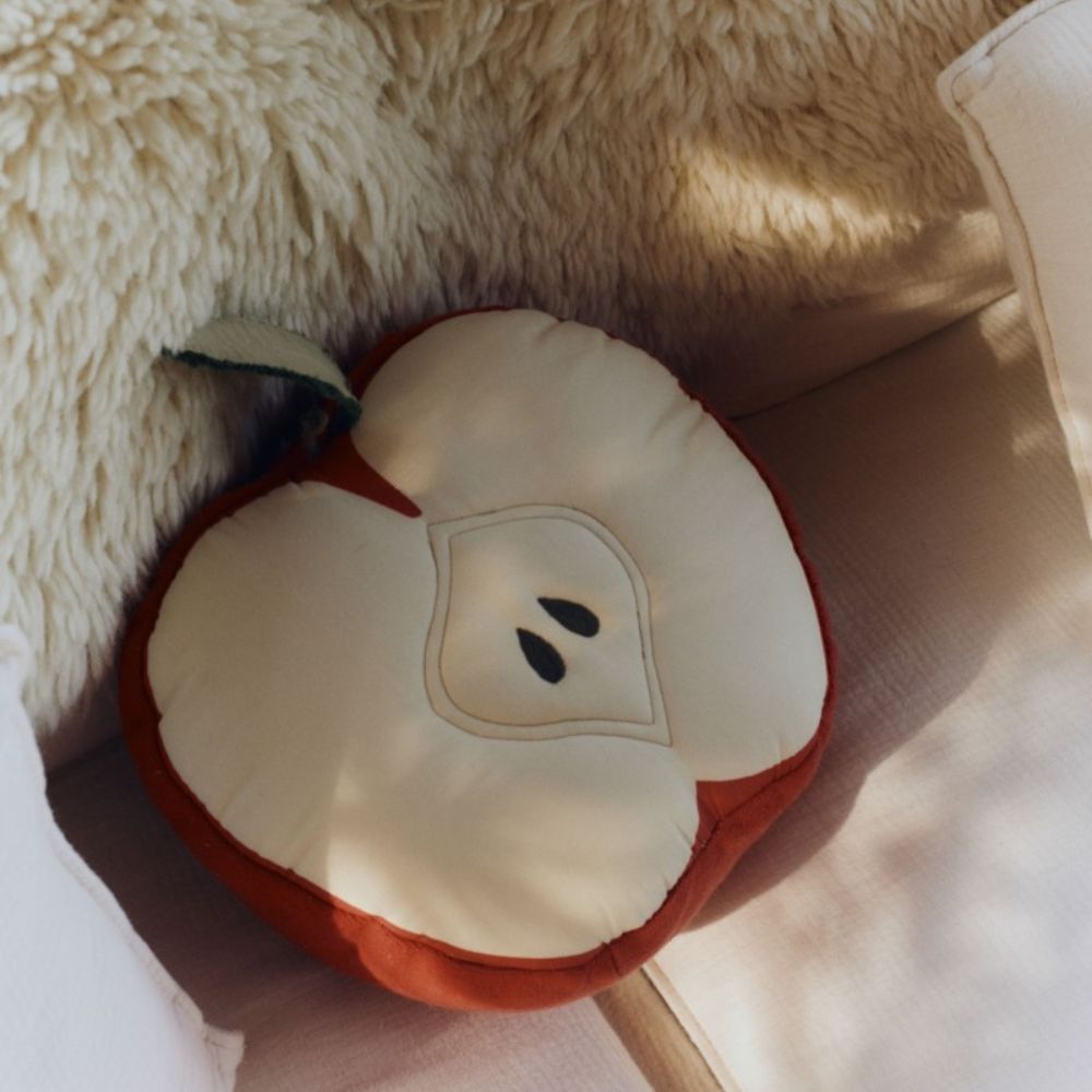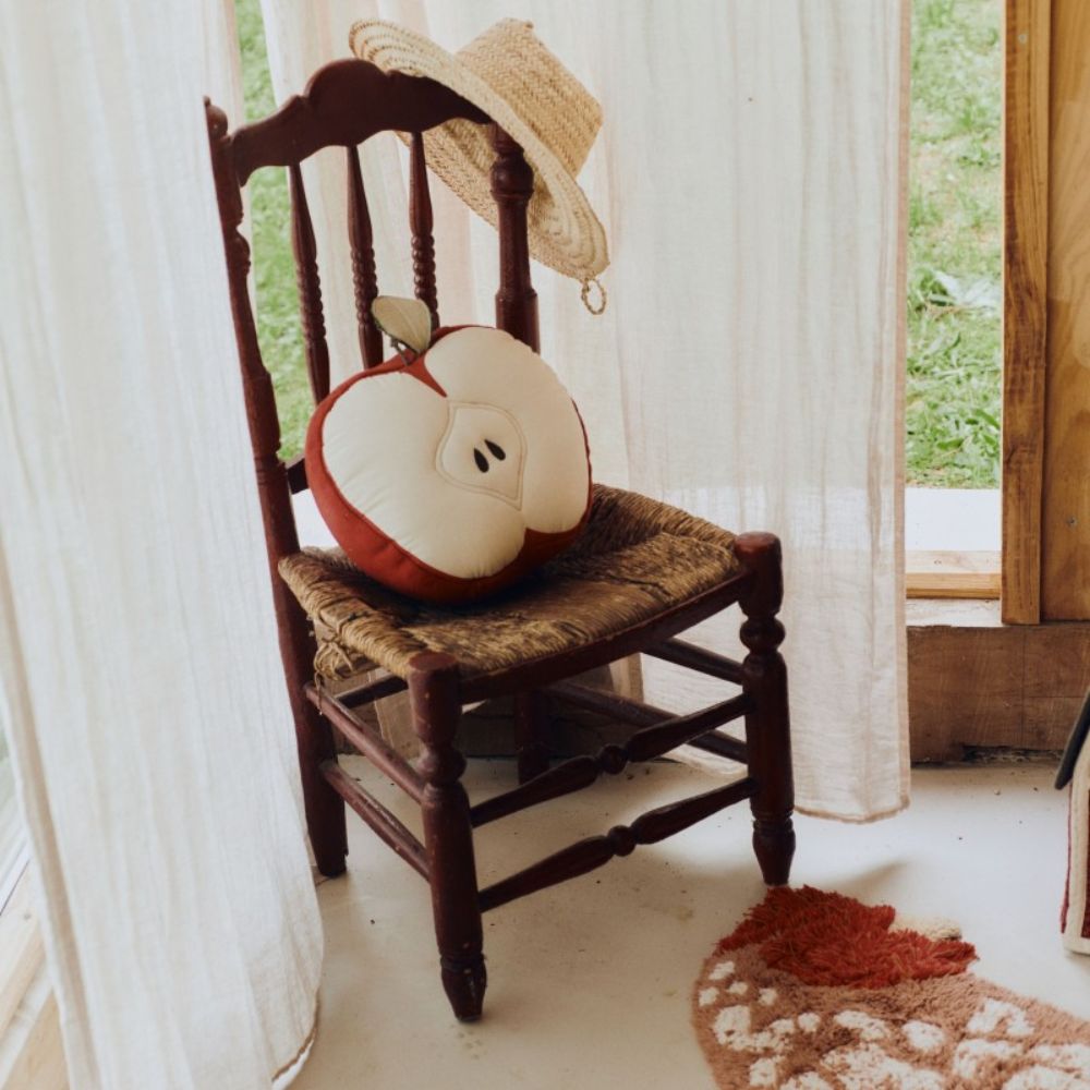 Puuvillast valmistatud pooliku õuna kujuline padi, mille peale on kinnitatud väike leht, lisab interjööri loodusliku ja rõõmsa puudutuse.
