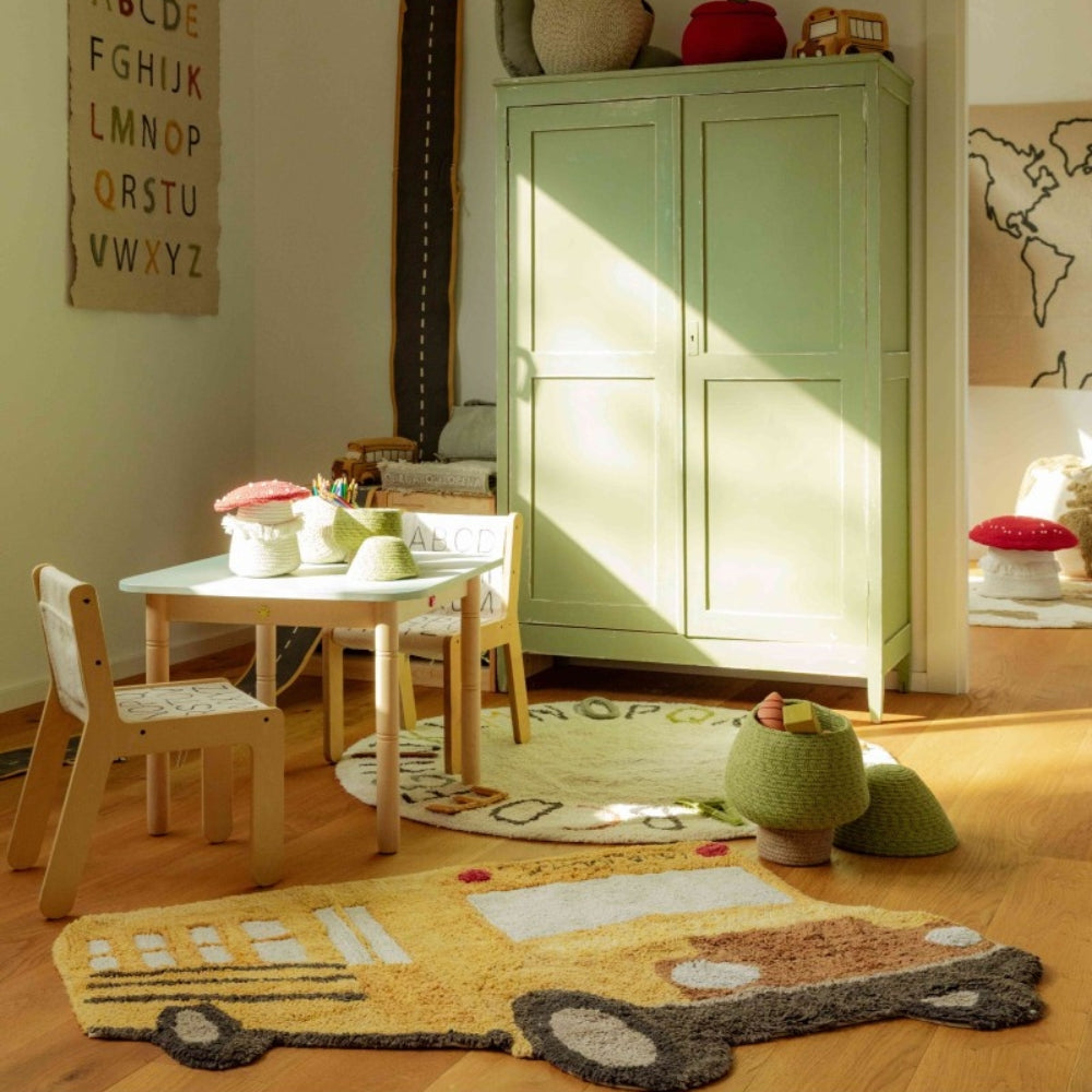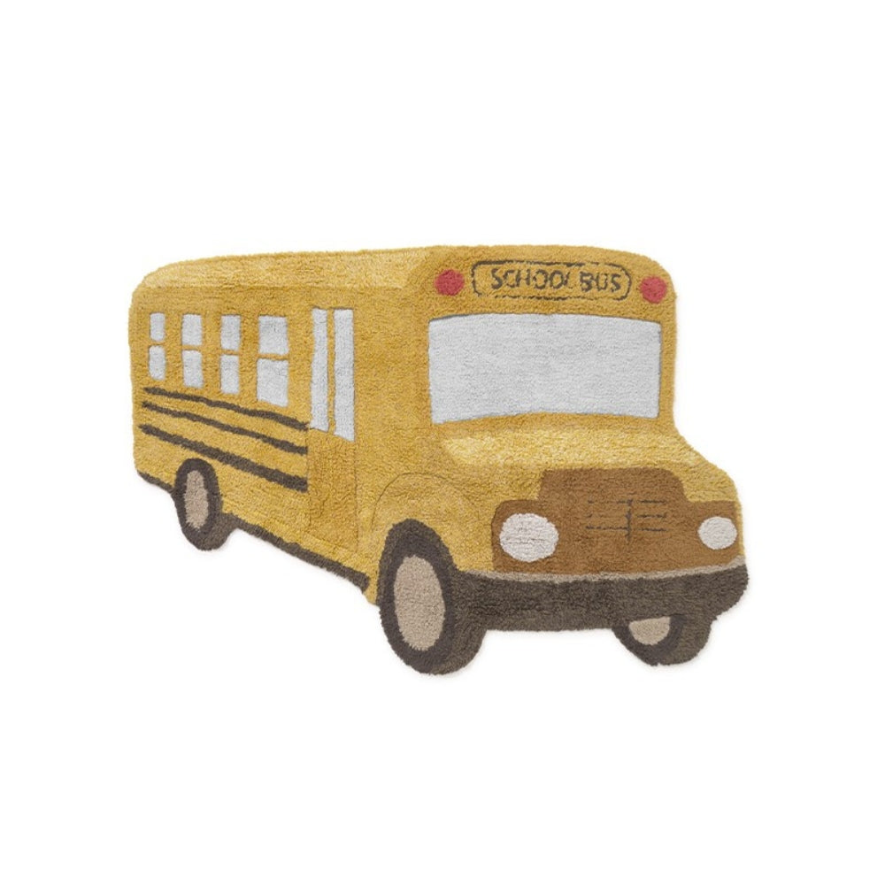 See käsitsi valmistatud puuvillane vaip klassikalise koolibussi kujul kollases värvis on silmapaistev ja muutub iga laste toa unikaalseks disainielemendiks.