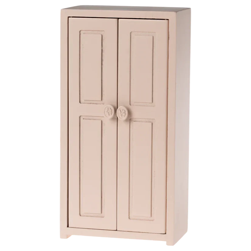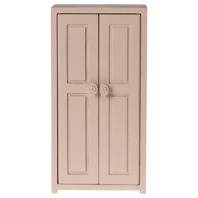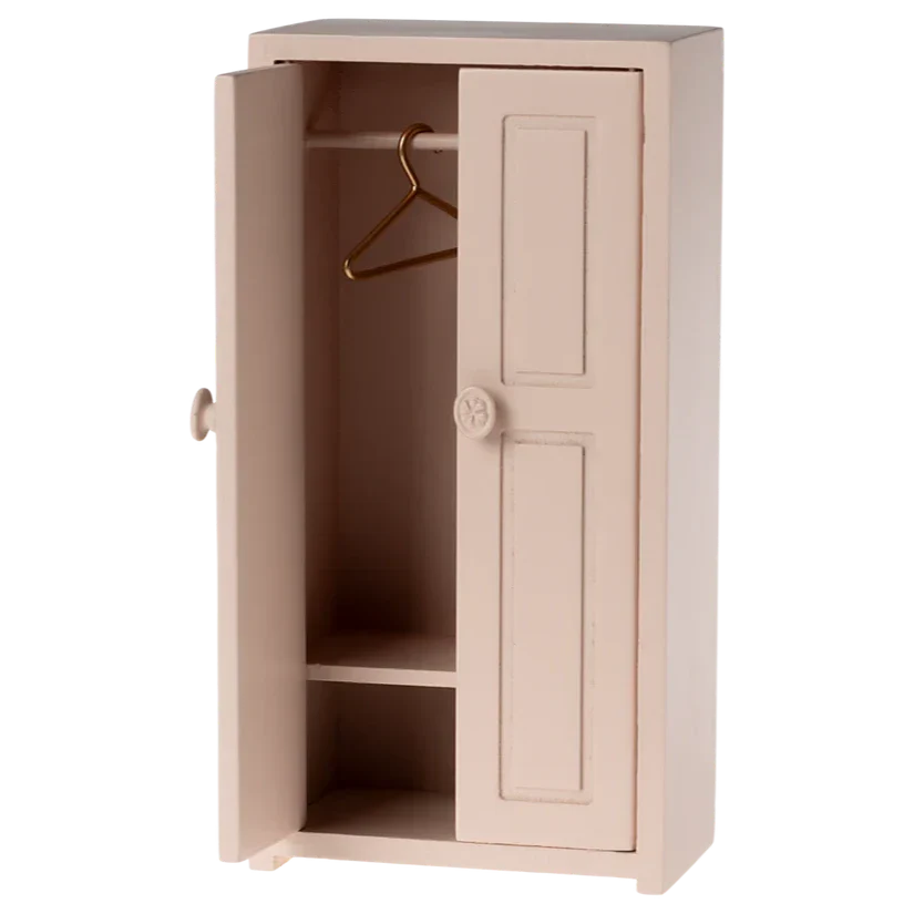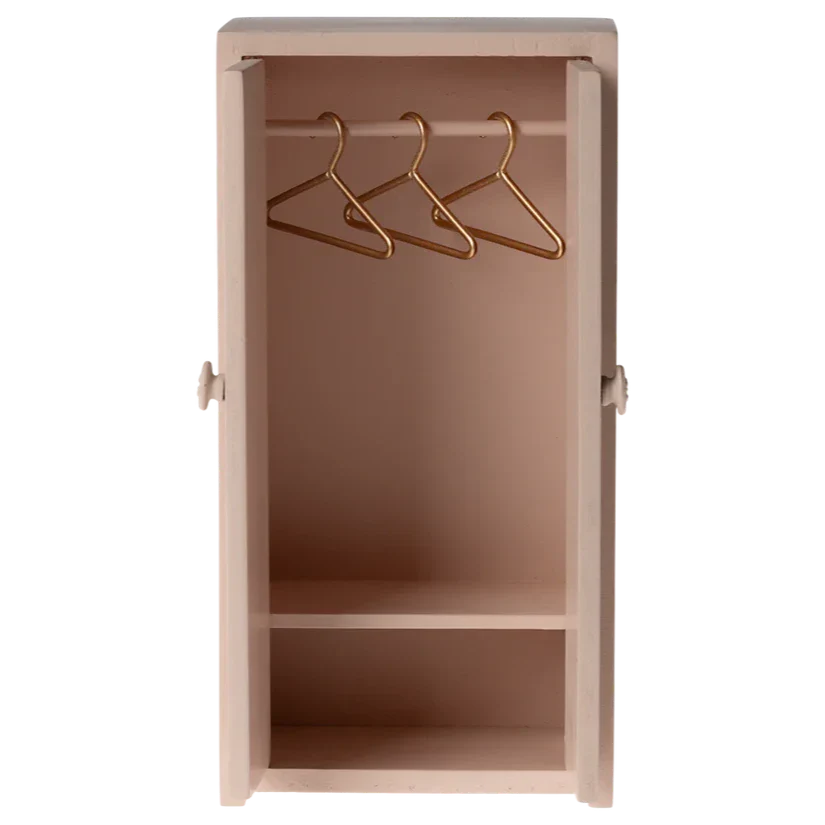 Maileg hiiremaja aksessuaarid – ilus ja stiilne miniatuurne riidekapp õrna roosa värviga.