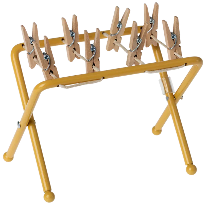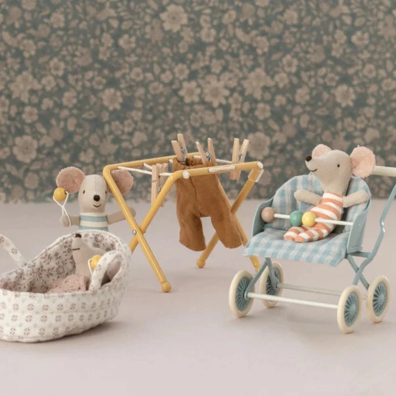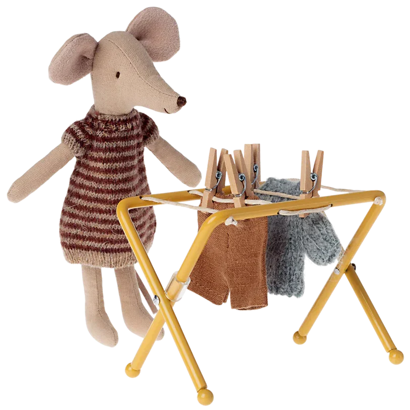 Mailegi kuivati ja väikesed puidust pesuklambrid moodustavad hiirte perekonna riietele suurepärase komplekti.