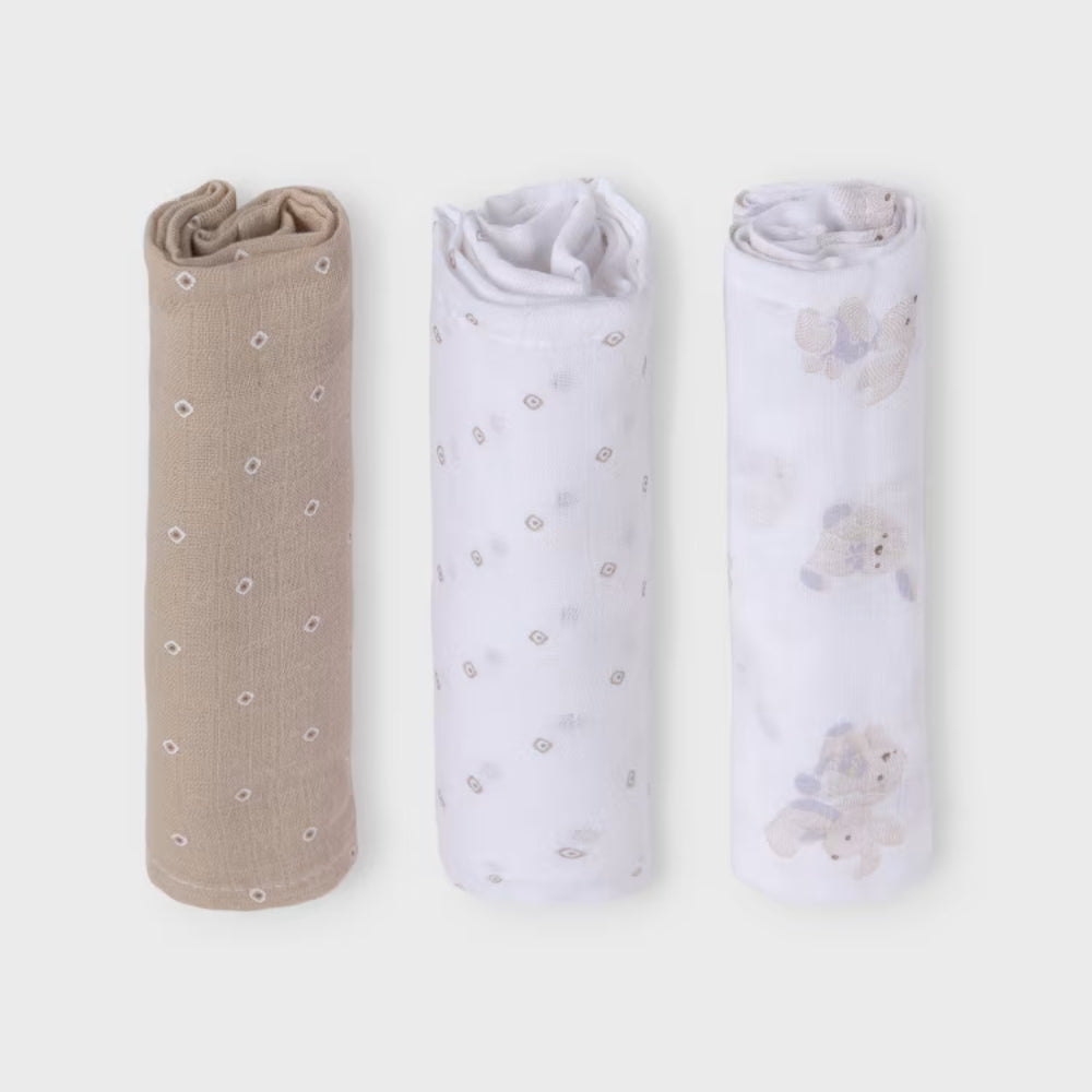 Komplekt sisaldab kolme pehmet ja õrna mähkmet, mis on valmistatud 100% puuvillast ja sobivad ideaalselt beebi tundlikule nahale.