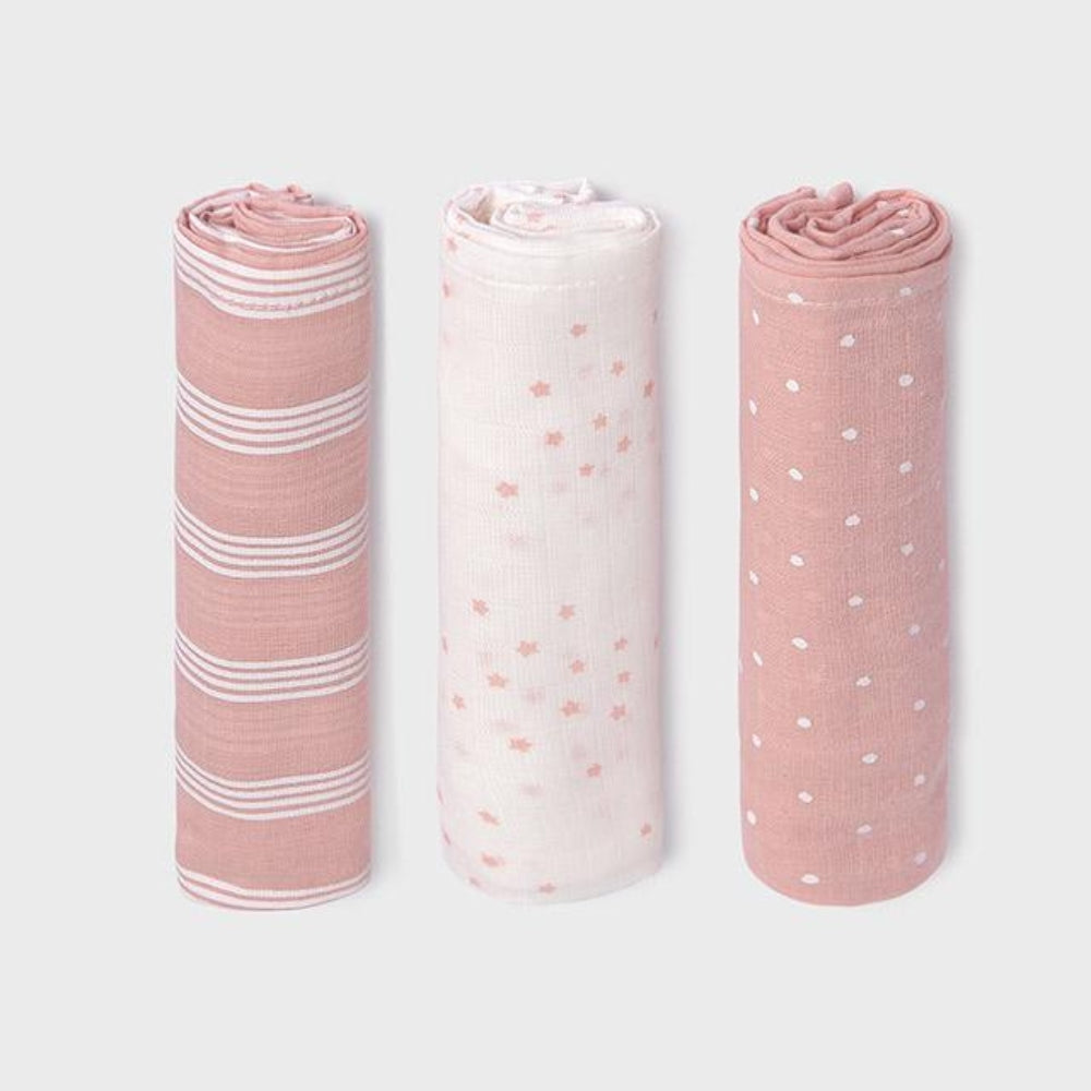 Komplekt sisaldab kolme pehmet ja õrna mähkmet, mis on valmistatud 100% puuvillast ja sobivad ideaalselt beebi tundlikule nahale.