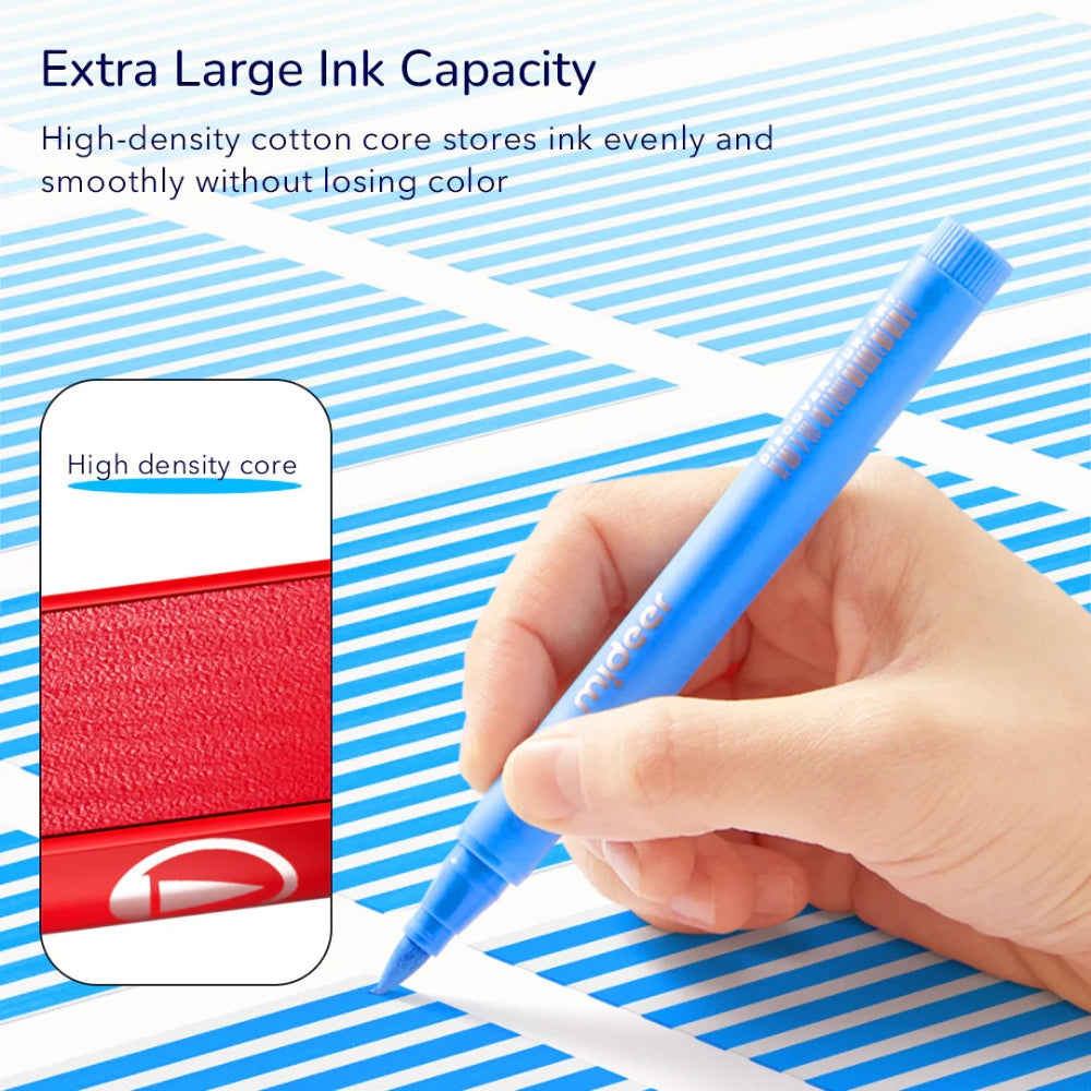 Mideer markerite komplekt sisaldab 24 akrüülmarkerit pehme harjaotsaga, mis võimaldab joonistada nii õhukesi kui ka paksemaid jooni.