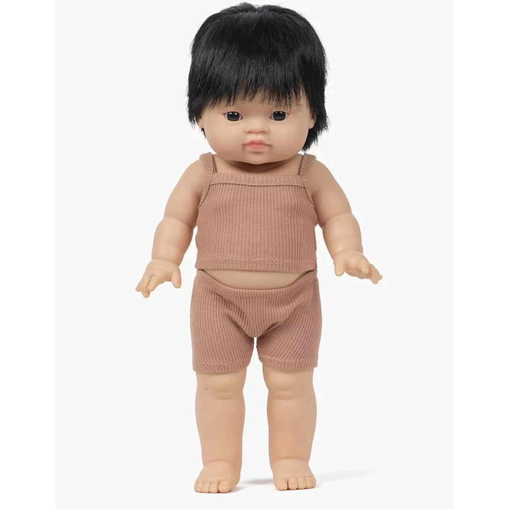 Nukk on 37 cm pikk ja tal on pruuni suhkru värvi ribitud aluspesu.