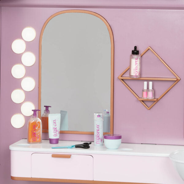 Unikaalne aksessuaar 46 cm pikkusele nukule Our Generationi ratastel juuksurisalongist.