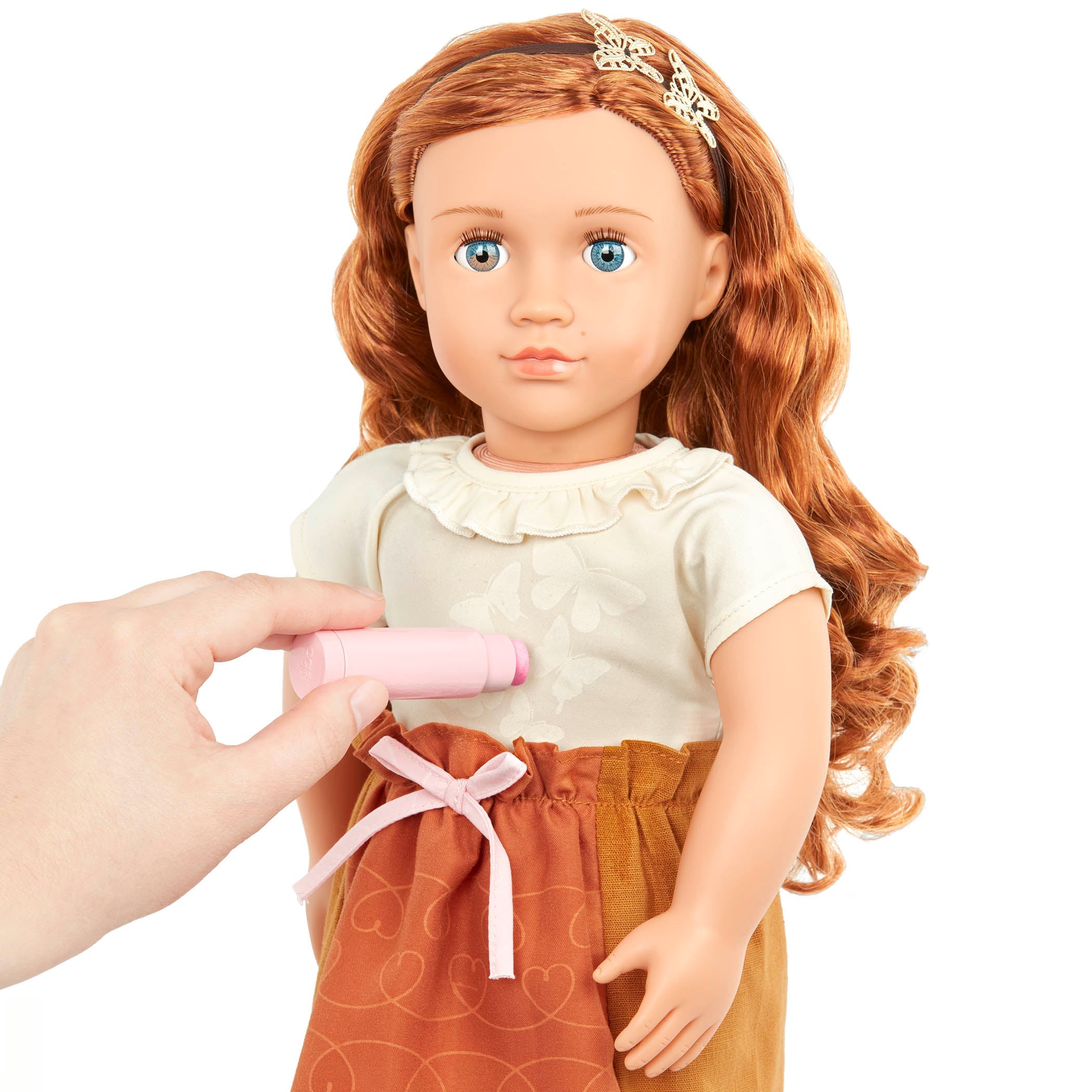 Our Generationi moekas 46 cm pikkune Nova laste nukk liblikamotiiviga ja peidetud mustritega riietel, mis sobib ideaalselt juuksurimängudeks.