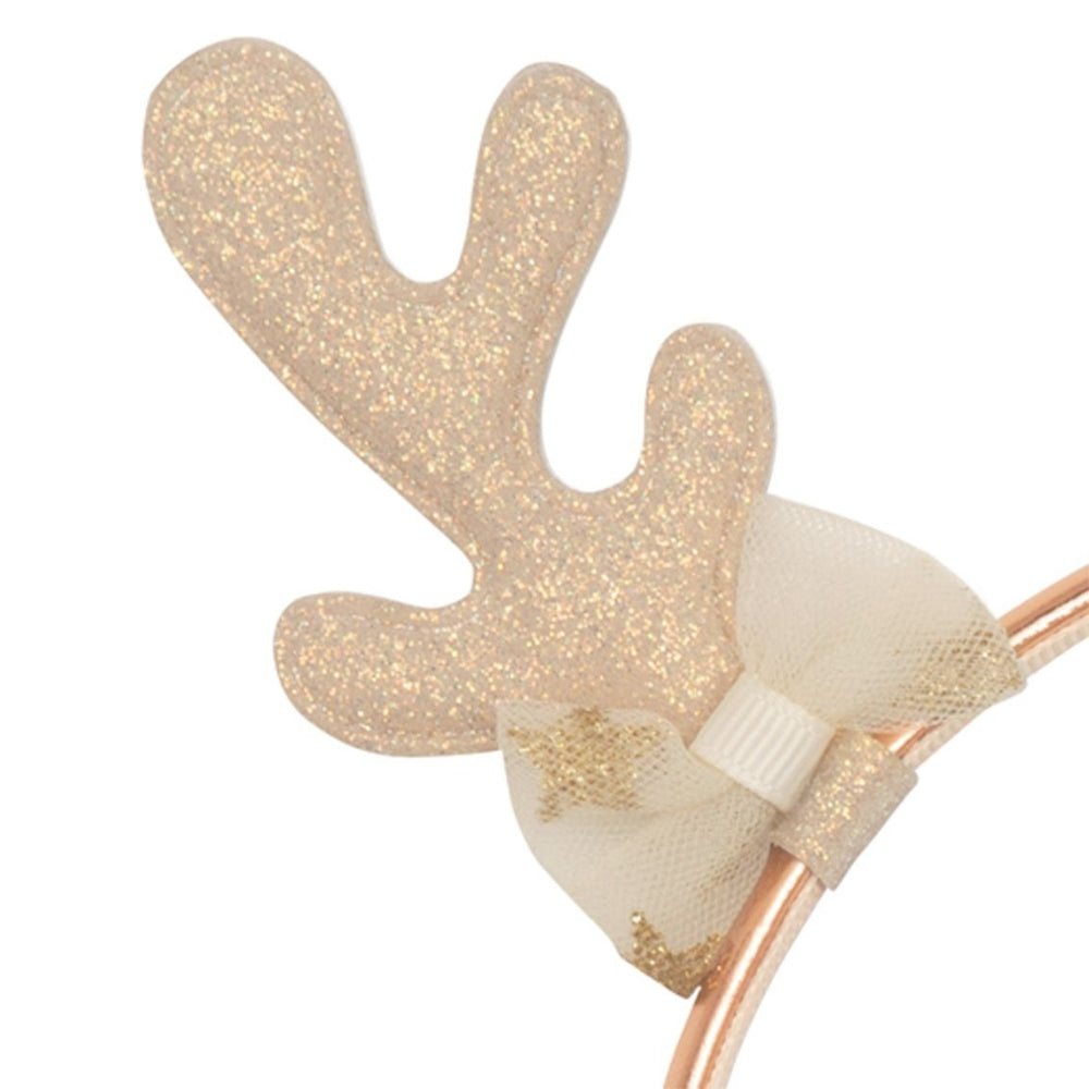 Kuldne juuksepand, millel on pehmed põhjapõdra sarved ja säravad glitterid, rõhutab ilusti lapselikku võlu ja sobib ideaalselt jõuludeks või talvepidudeks.