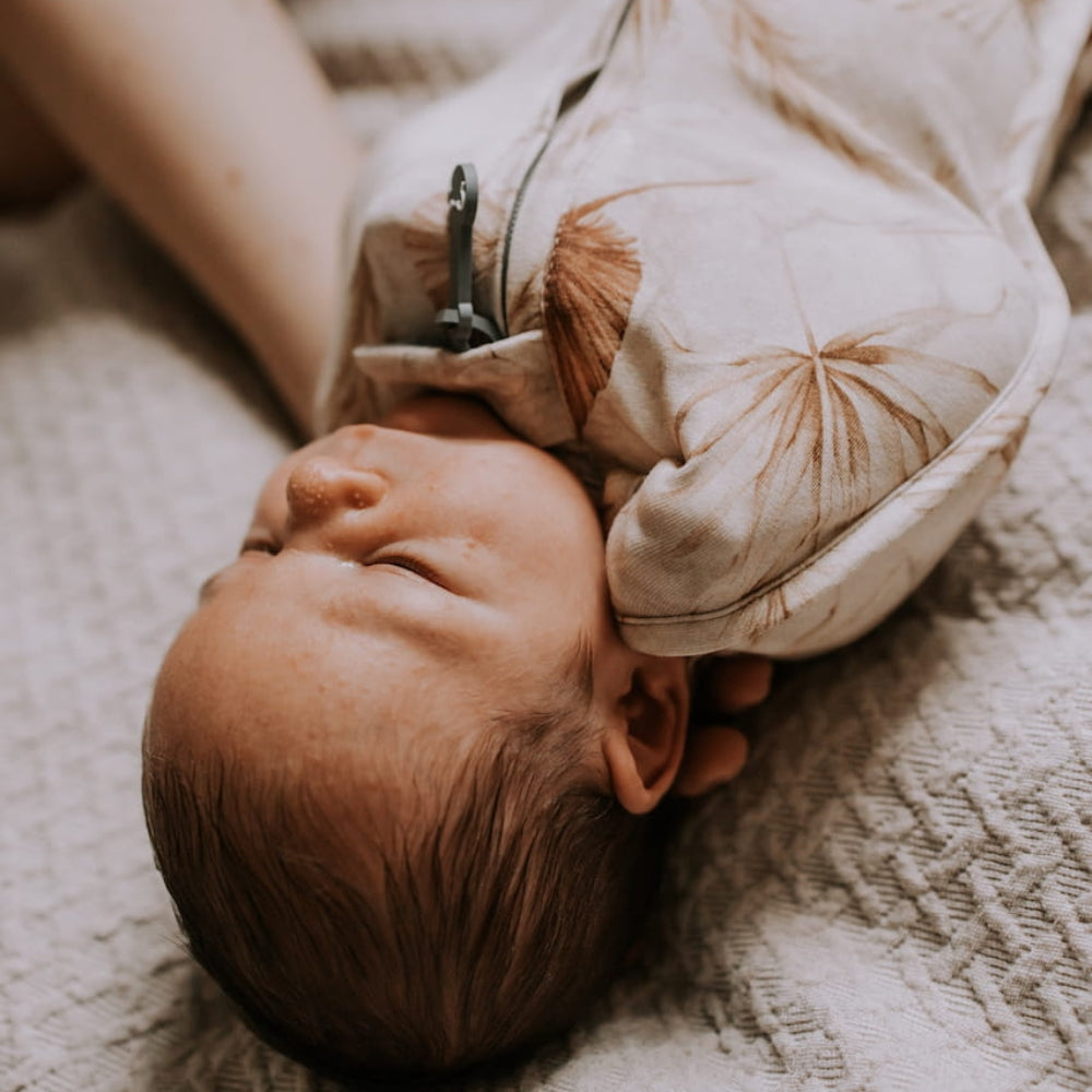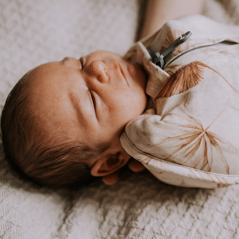 Sleepee esimese sammu beebivõre boheemlasliku botaanilise mütsiga.