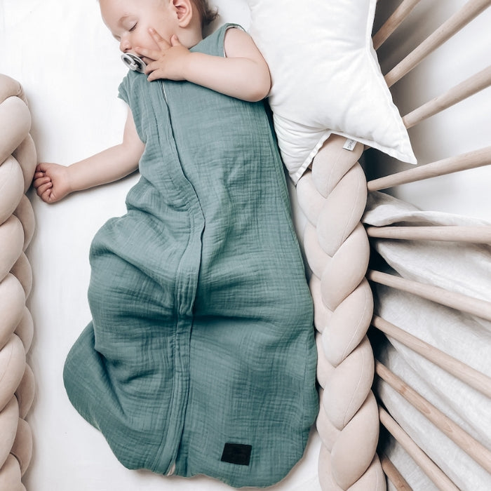 Kvaliteetsest pehmest musliinist valmistatud magamiskott on beebi nahale õrn ja tagab suurepärase õhuringluse.