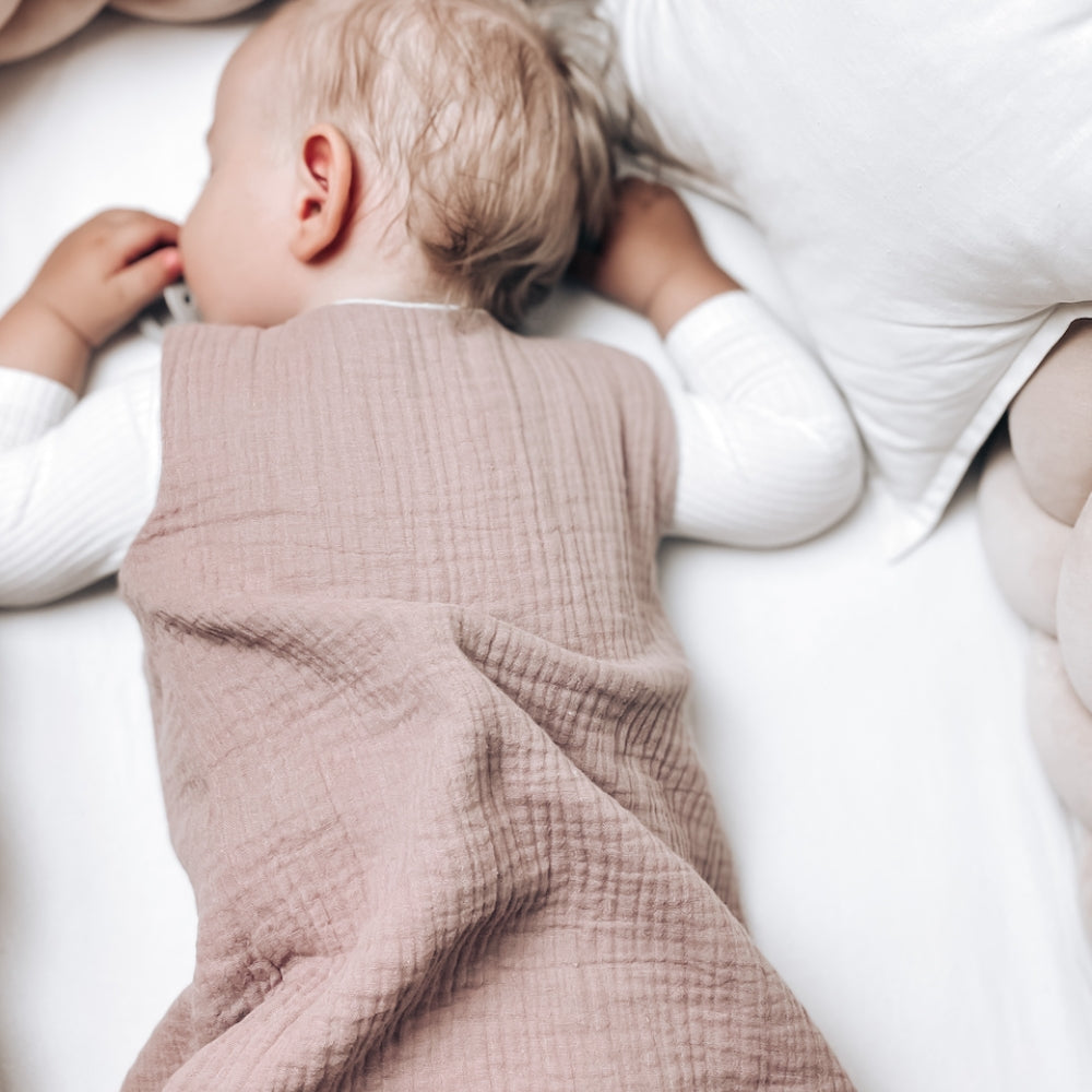 Kvaliteetsest pehmest musliinist valmistatud magamiskott on beebi nahale õrn ja tagab suurepärase õhuringluse.