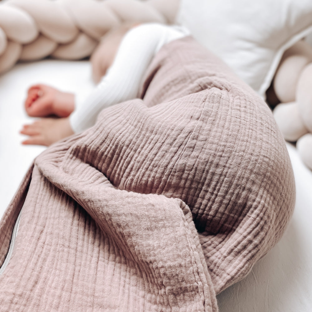 Kvaliteetsest pehmest musliinist valmistatud magamiskott on beebi nahale õrn ja tagab suurepärase õhuringluse.