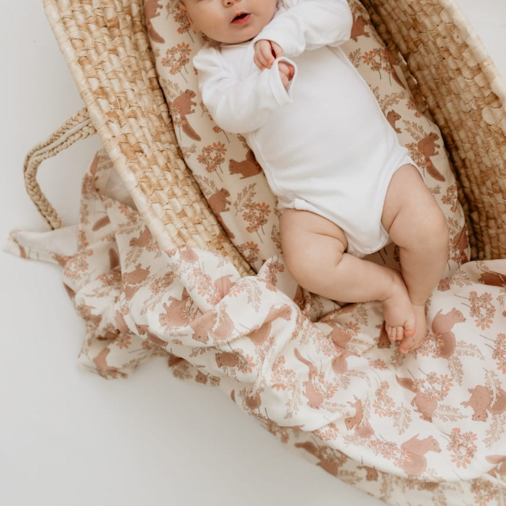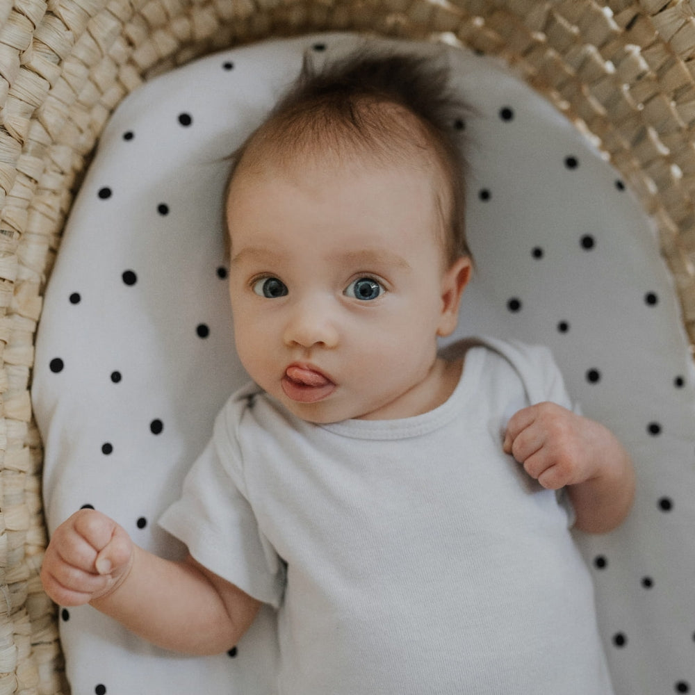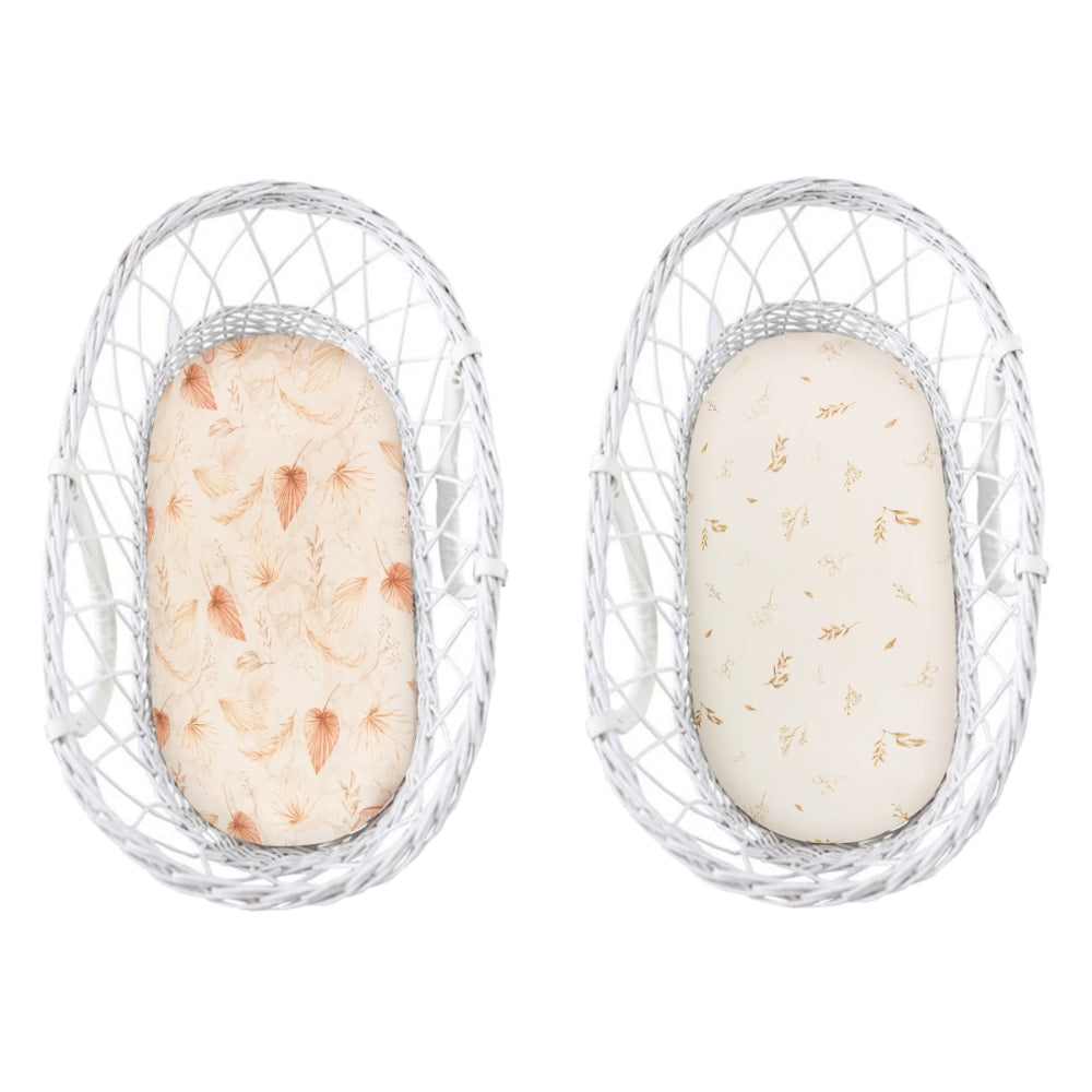 Komplekt sisaldab kahte lehte, mis on valmistatud kõrgekvaliteedilisest paksust puuvillast kangast, millele on lisatud 8% elastaani, mis muudab need eriti pehmeks, venivaks ja sobivaks igasse kandekotti, Moosese korvi või hälli.