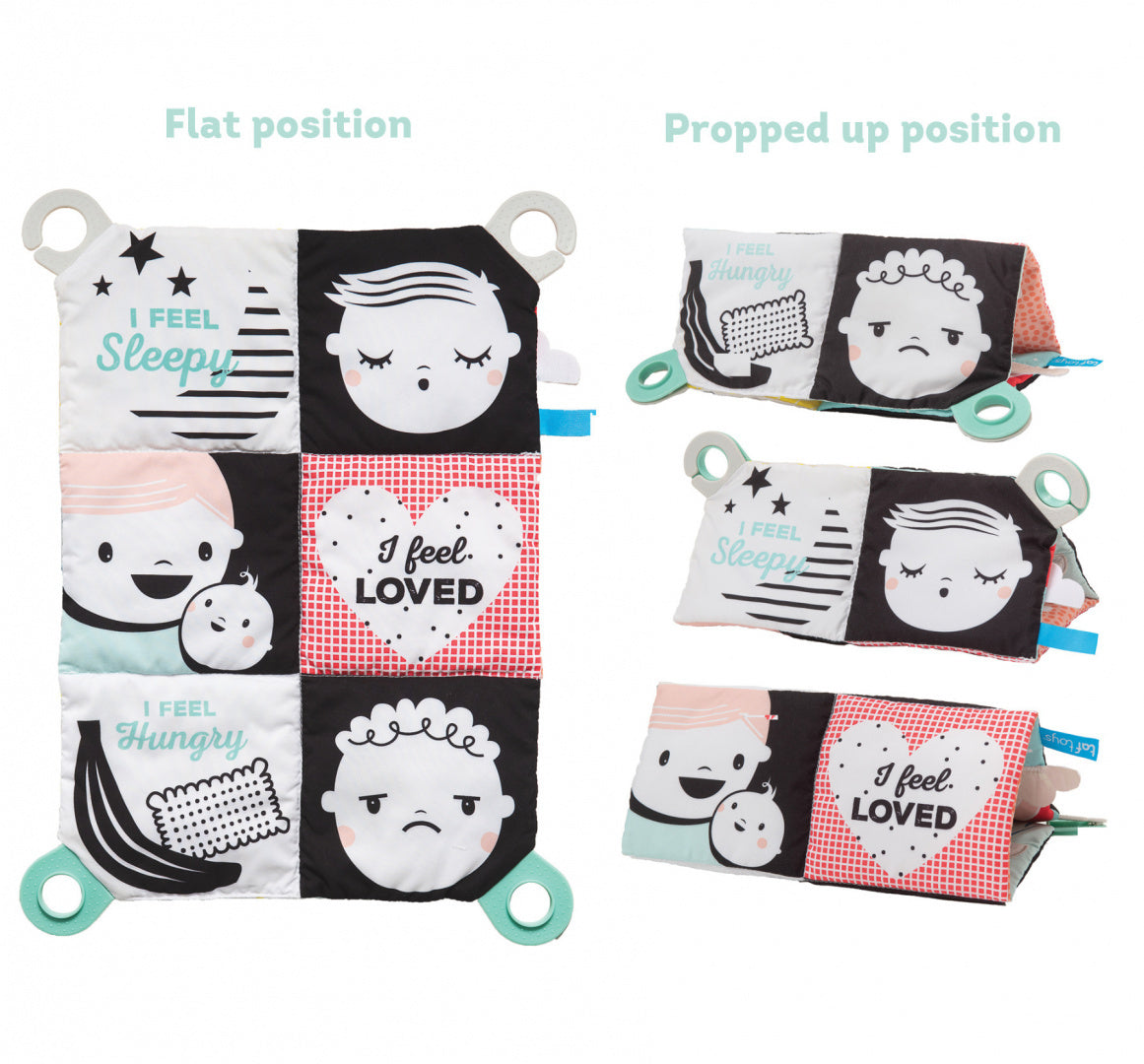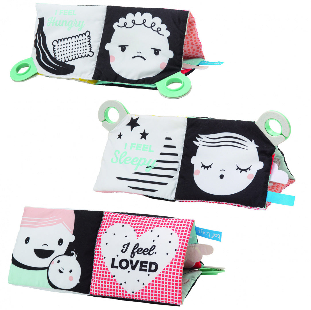 Pildid kujutavad viit emotsiooni, mida väljendavad näoilmed, mis aitavad arendada beebi emotsionaalset intelligentsust. Selle saab kokku voltida kotiks, et seda oleks lihtsam hoiustada.