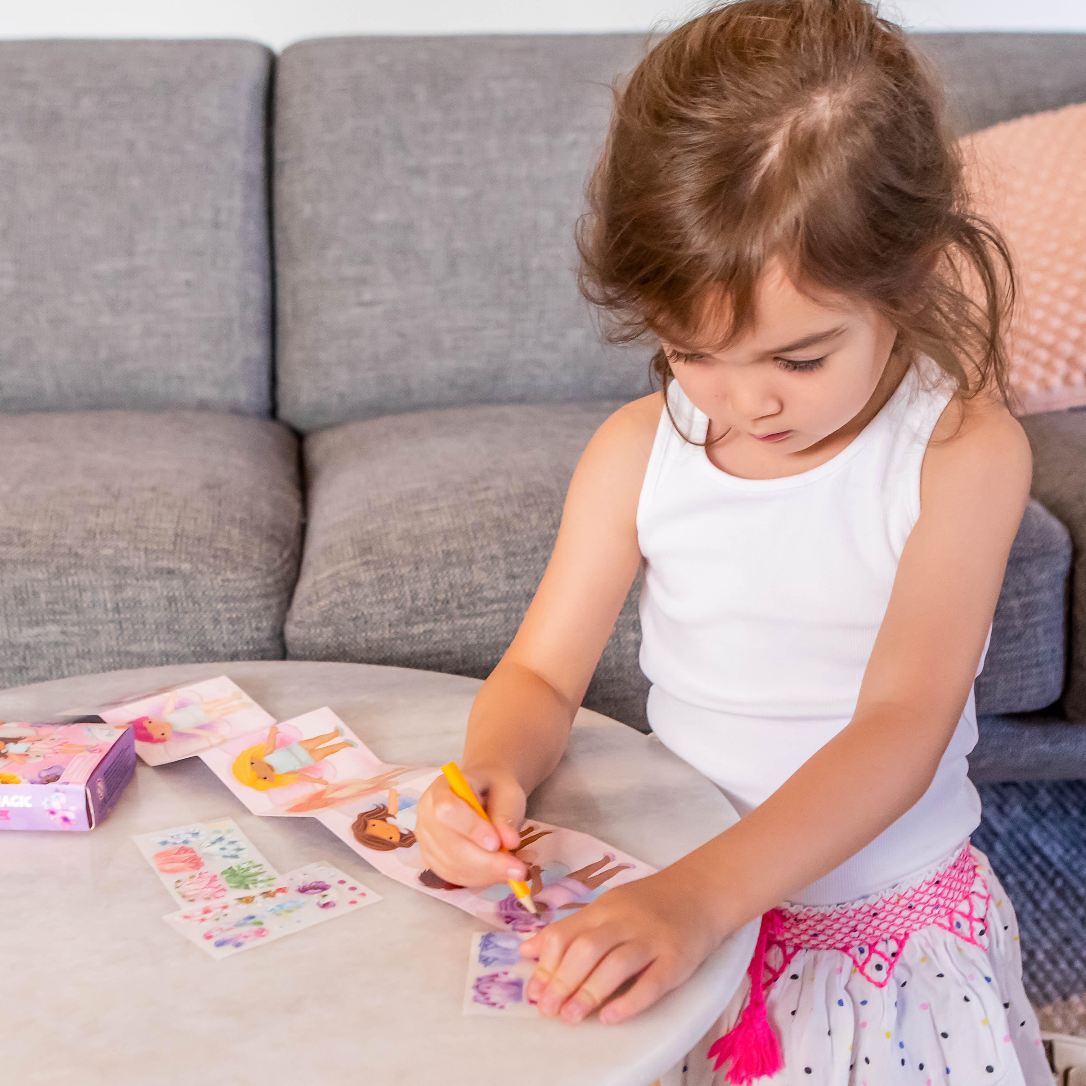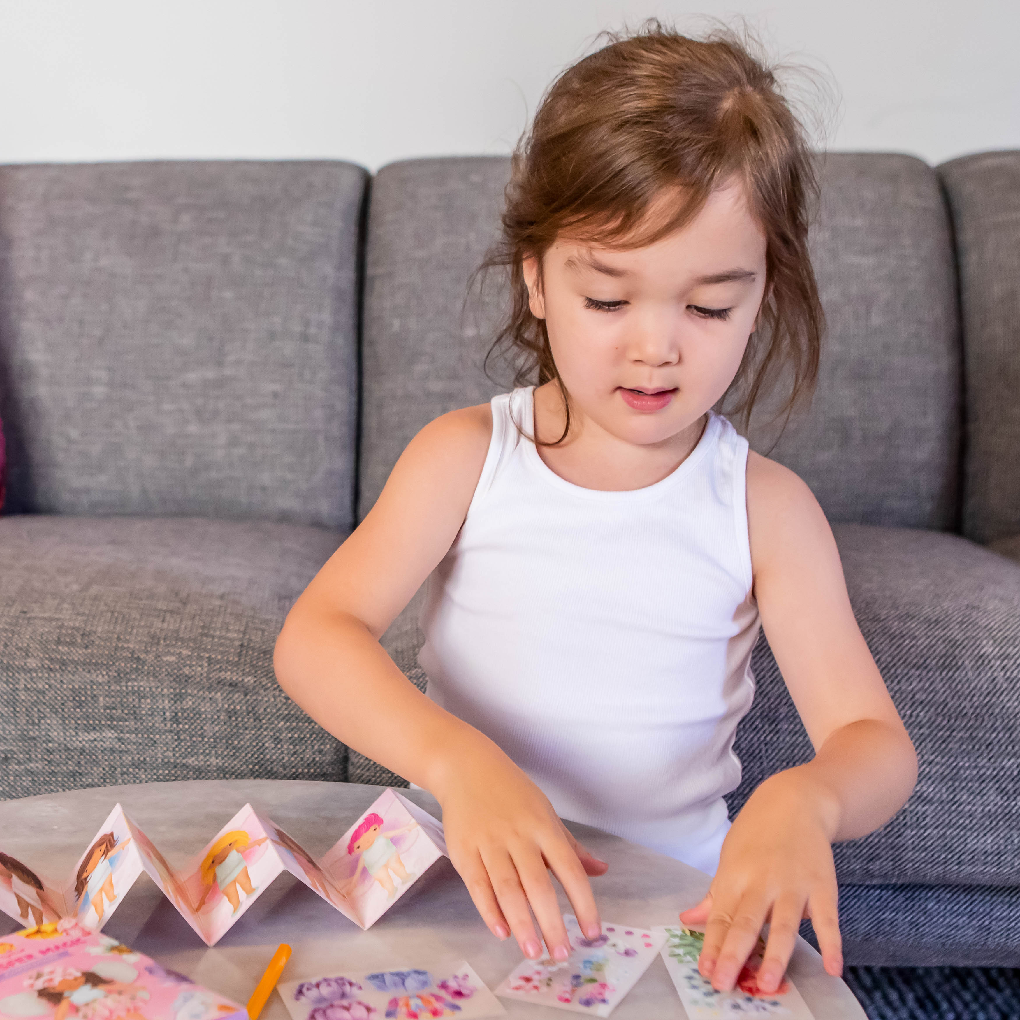 Komplektis: 1x tahvel tegelastega (akordionina kokku volditud), 3x lehte värvilisi kleebiseid, 1x pliiats - Arendatavad oskused: loovus, kujutlusvõime,motoorika